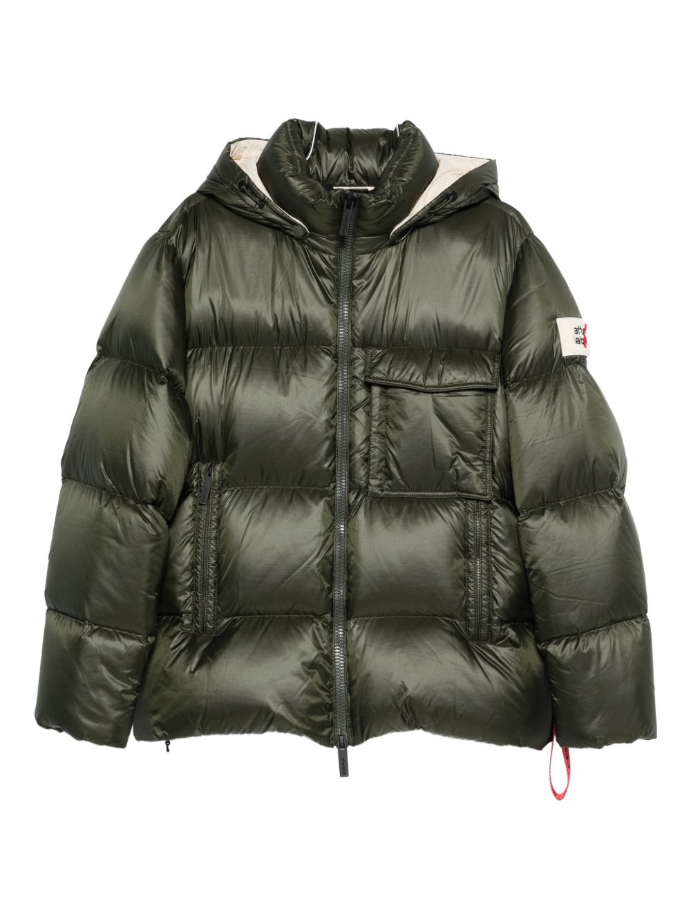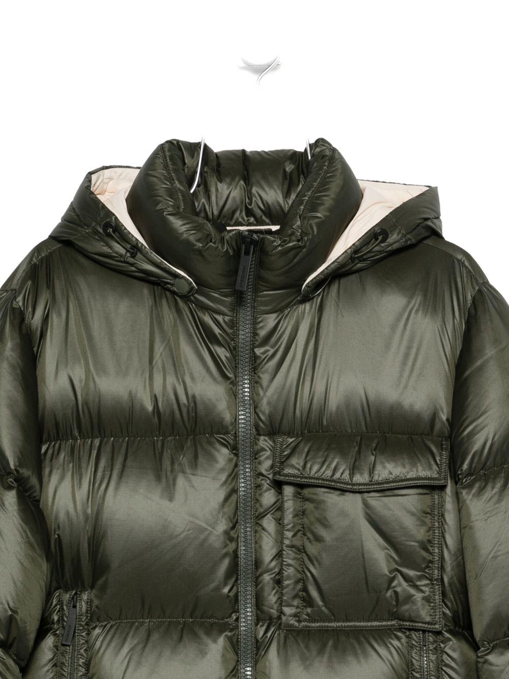 Cappuccio con coulisse regolabile, chiusura frontale e tasche a filetto con zip, patch con logo sulla manica sinistra, pendaglio rosso logato.