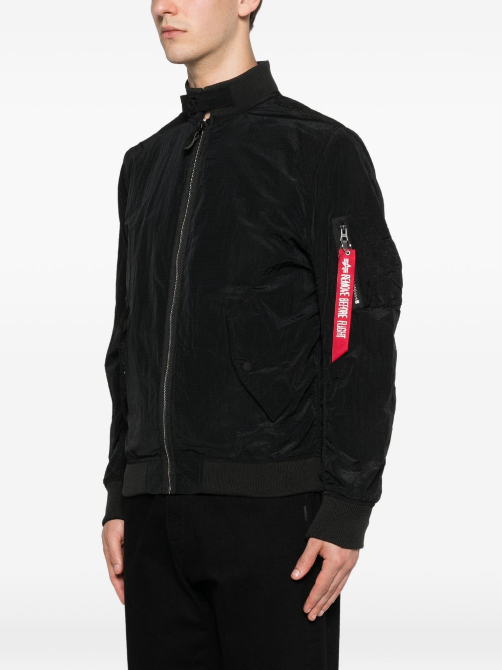 Bomber Alpha Industries in nylon ripstop nero, caratterizzato da struttura resistente e dettagli iconici come tasca sulla manica e zip robusta.