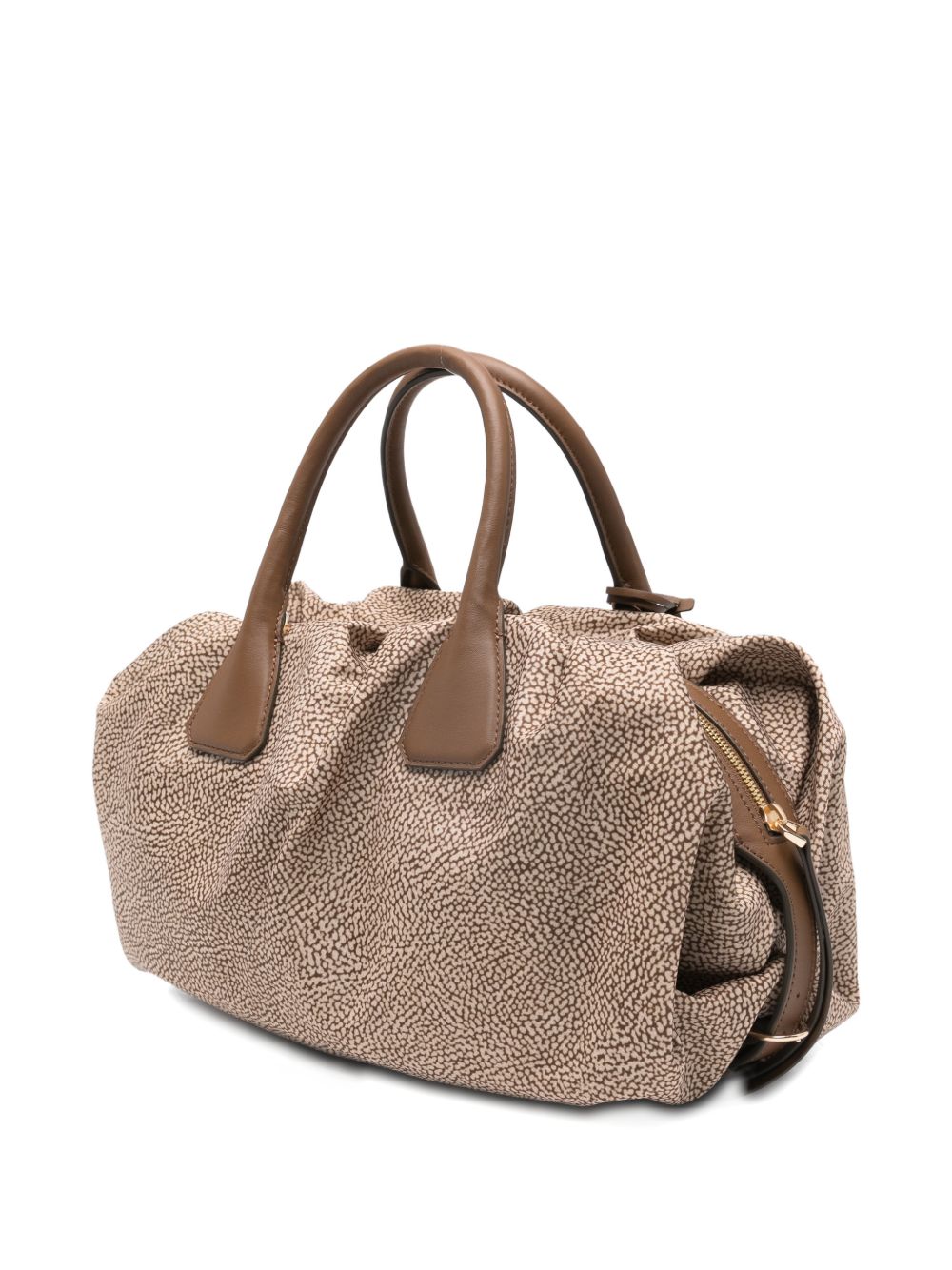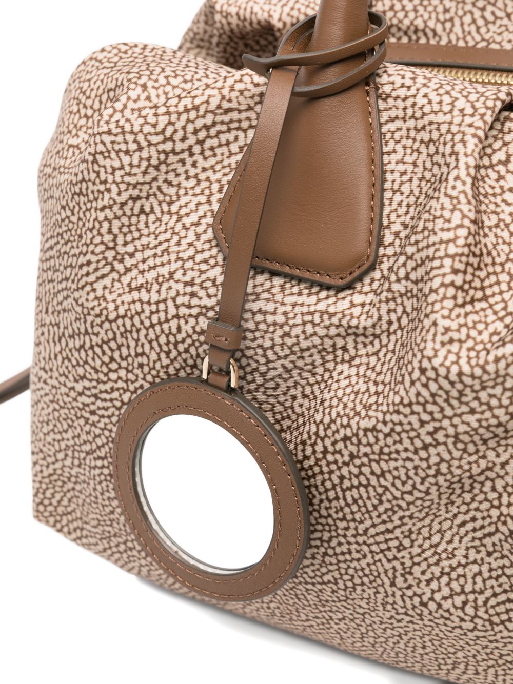 realizzata in tessuto, dettagli in pelle, charm con specchio, chiusura superiore con zip, tracolla removibile, larghezza 34 cm, altezza 20 cm, profondità 17 cm, manico 14 cm