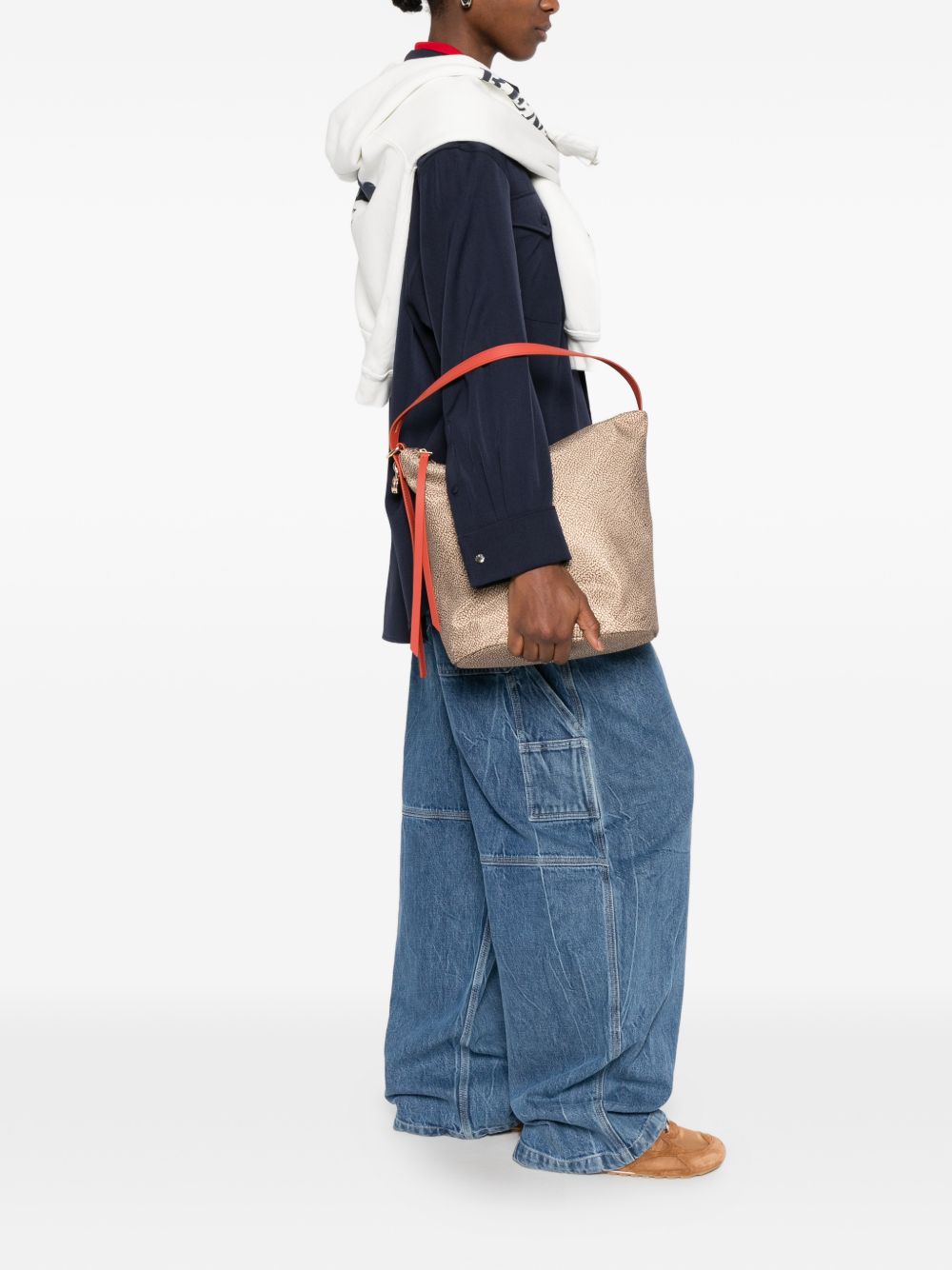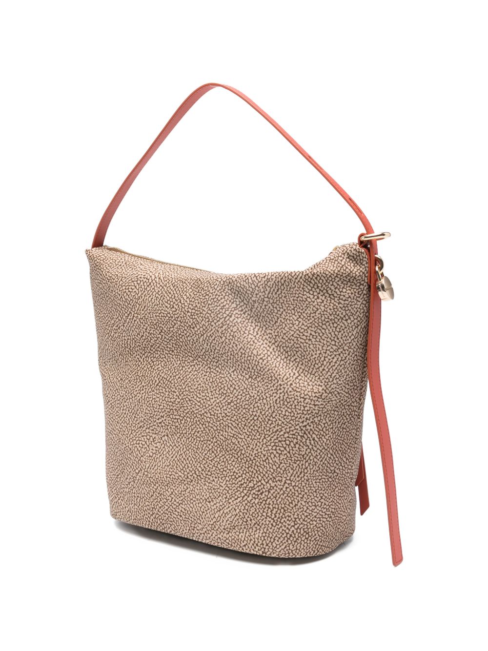 realizzata in tessuto, dettagli in pelle, chiusura superiore con zip, pendente a disco, tasca interna a soffietto, lunghezza 34 cm, altezza 25 cm, profondità 14 cm, manico 16 cm