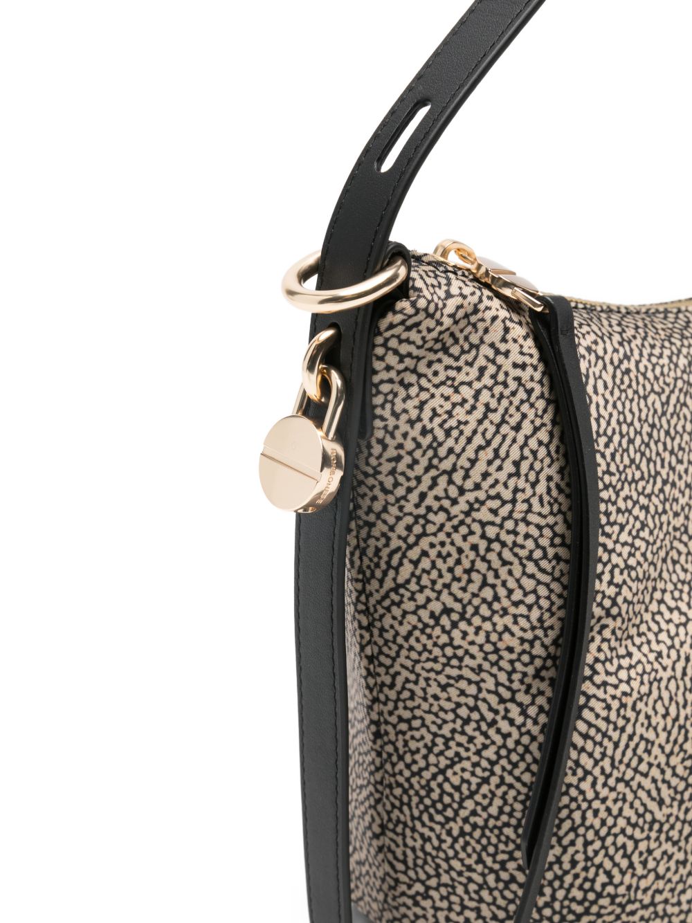 realizzata in tessuto, dettagli in pelle, chiusura superiore con zip, tasca interna a soffietto, lunghezza 25 cm, altezza 17 cm, profondità 12 cm, manico 15 cm