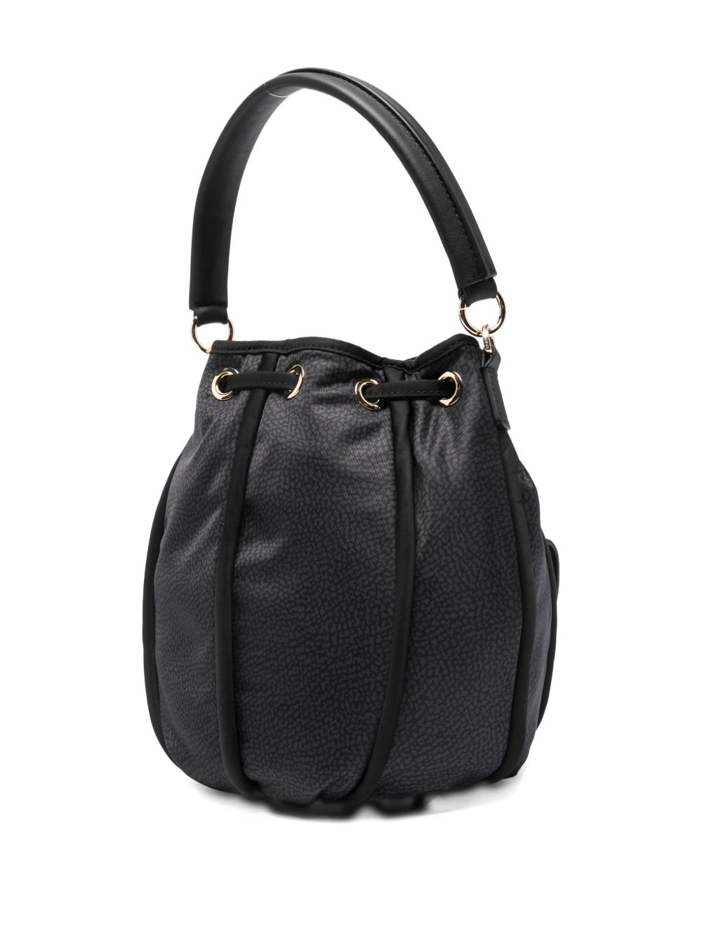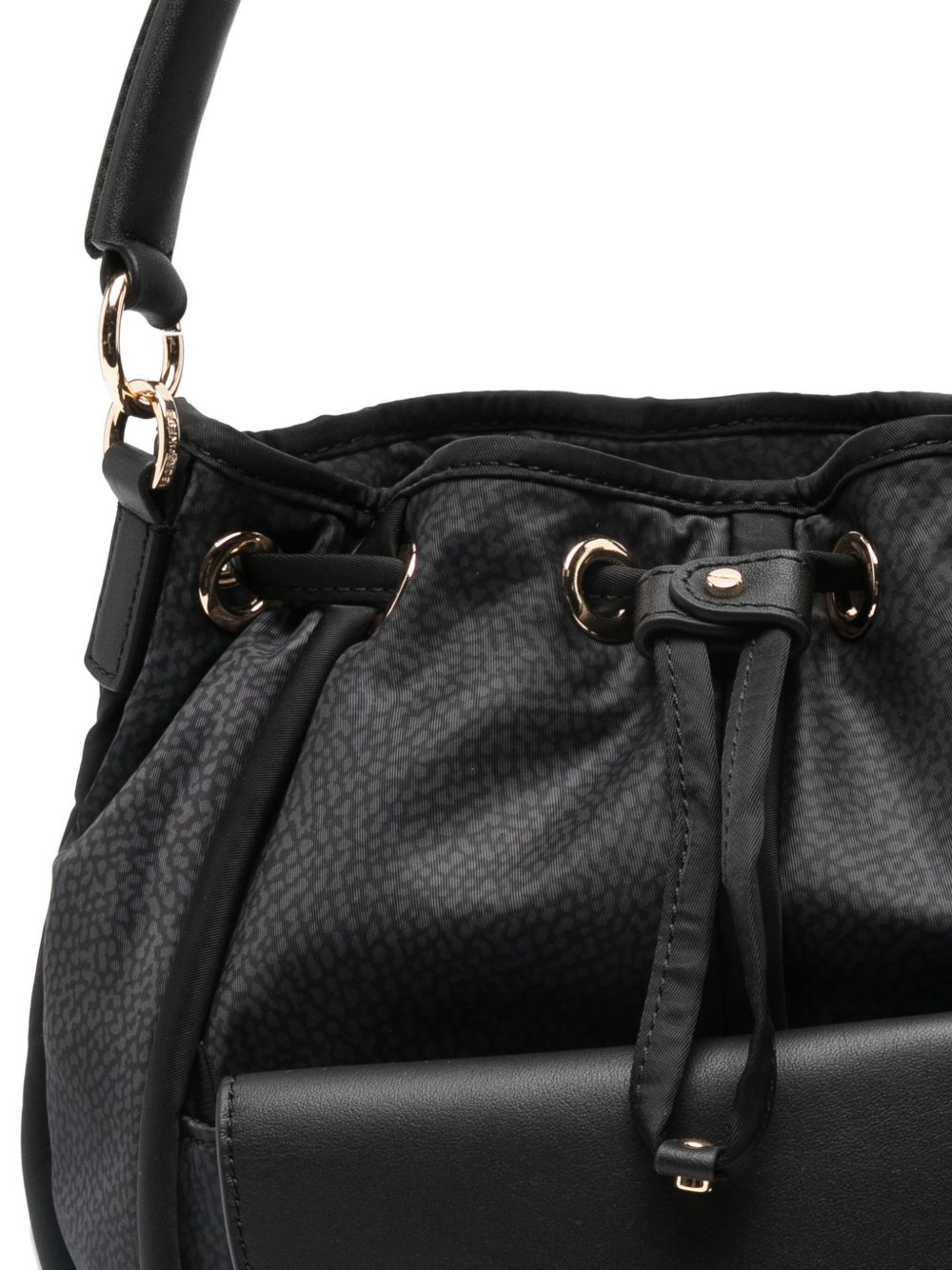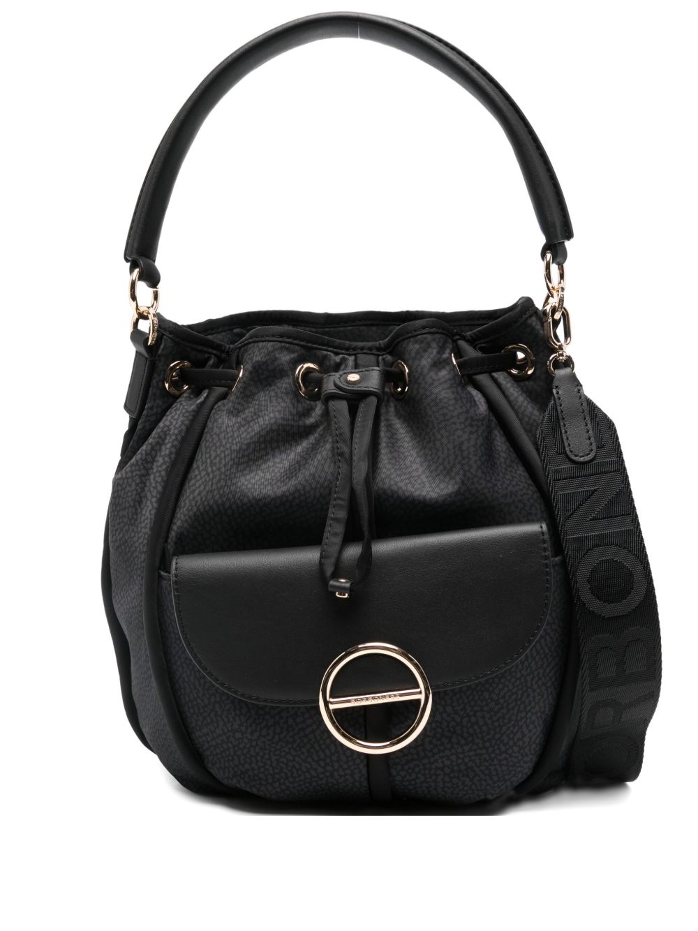 Realizzata in pelle di vitello, dettagli in metallo color oro, tasca frontale con patta, chiusura con coulisse, altezza 27 cm, profondità 24 cm, larghezza 24 cm