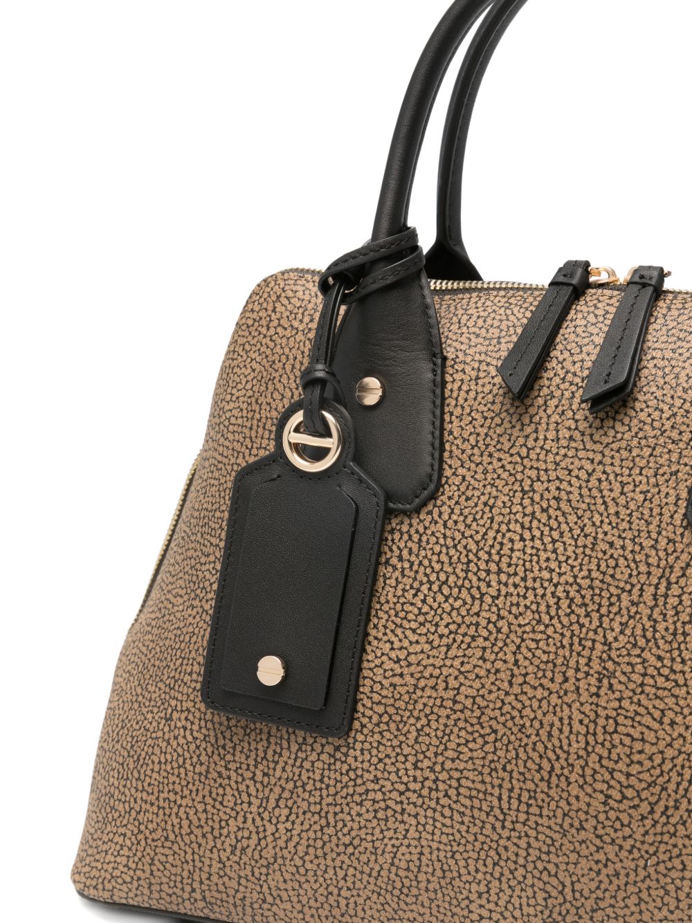 Realizzata in pelle, stampa Op, doppio manico fisso, chiusura superiore con cerniera, tasca interna a soffietto, accessorio badge etichetta removibile, dettagli in metallo color oro, larghezza 35 cm, altezza 22 cm, profondità 13 cm, 100% pelle, 100% poliuretano