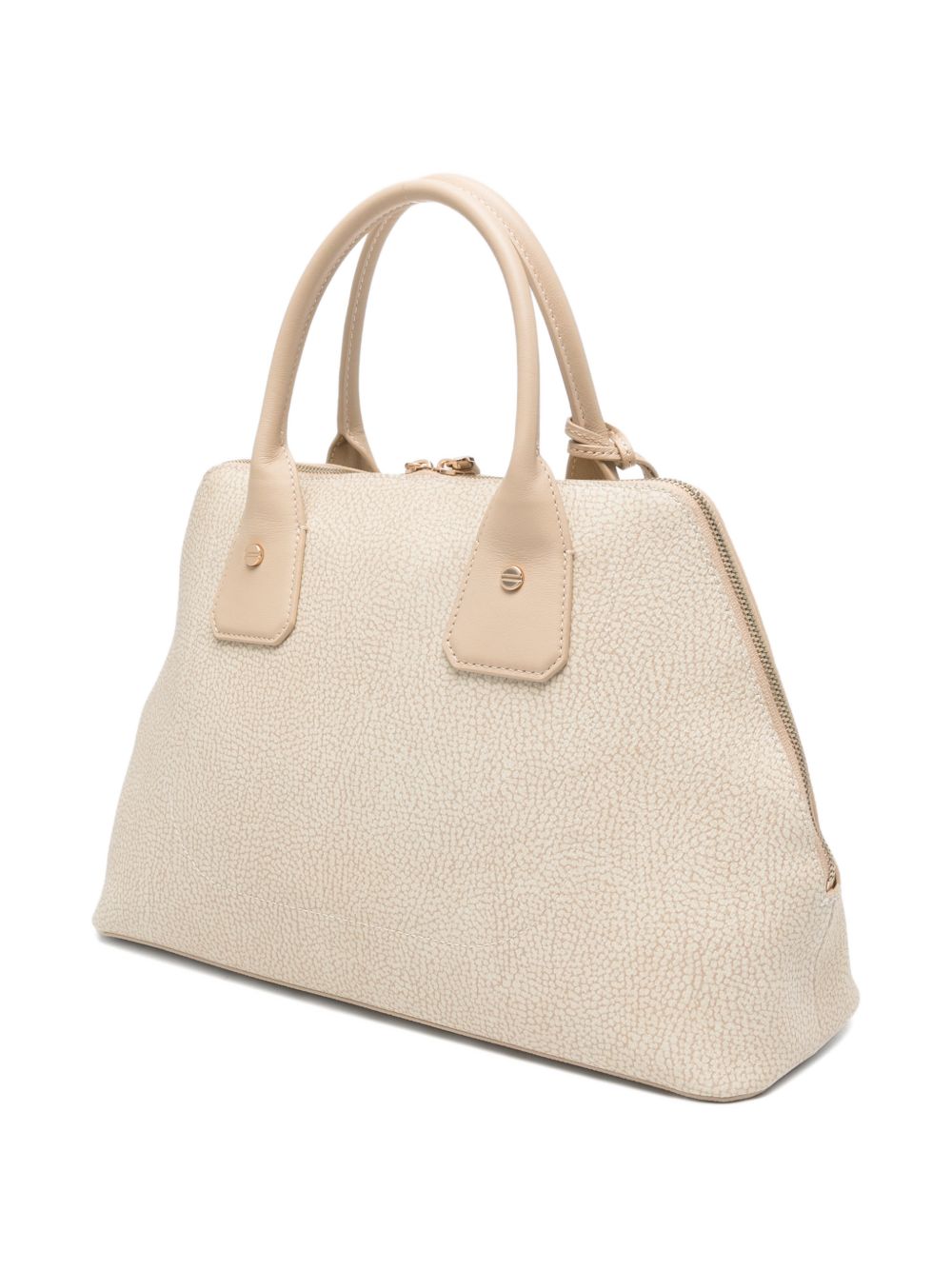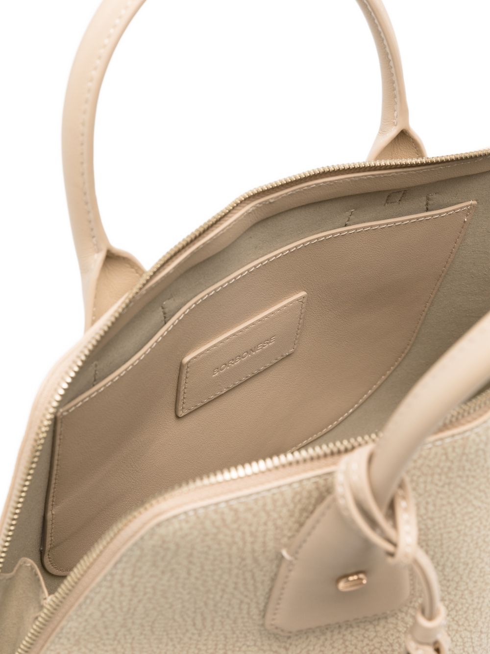 Realizzata in pelle, doppio manico fisso, chiusura superiore con cerniera, tasca interna a soffietto, accessorio badge etichetta removibile, dettagli in metallo color oro, larghezza 35 cm, altezza 22 cm, profondità 13 cm, 100% pelle, 100% poliuretano