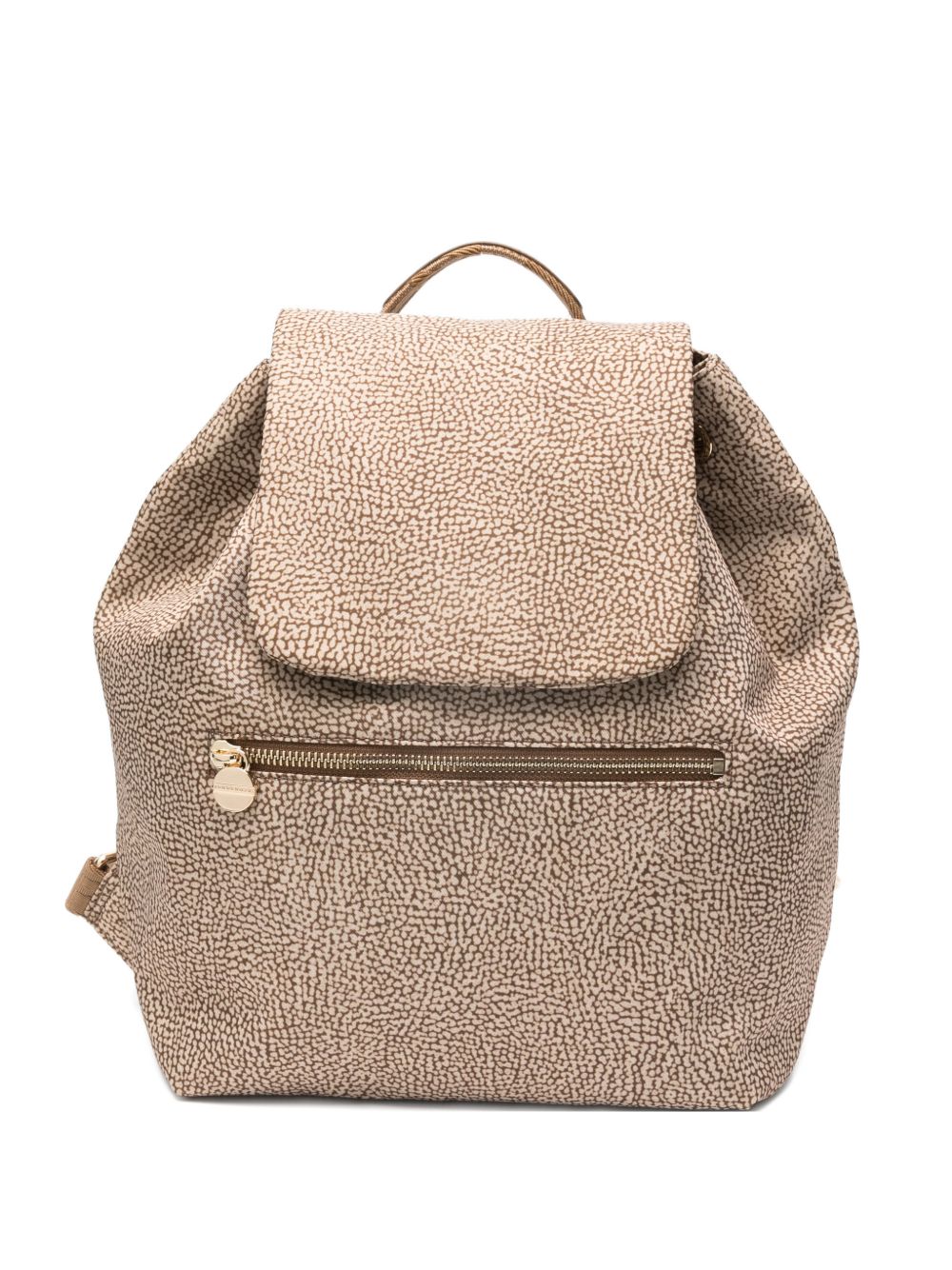 Realizzato in tessuto riciclato, stampa Op, spallacci logati regolabili, tasca esterna e interna con cerniera, apertura superiore con coulisse, dettagli in metallo color oro, altezza 31 cm, larghezza 18 cm, profondità 28 cm, 100% poliestere, 100% pelle