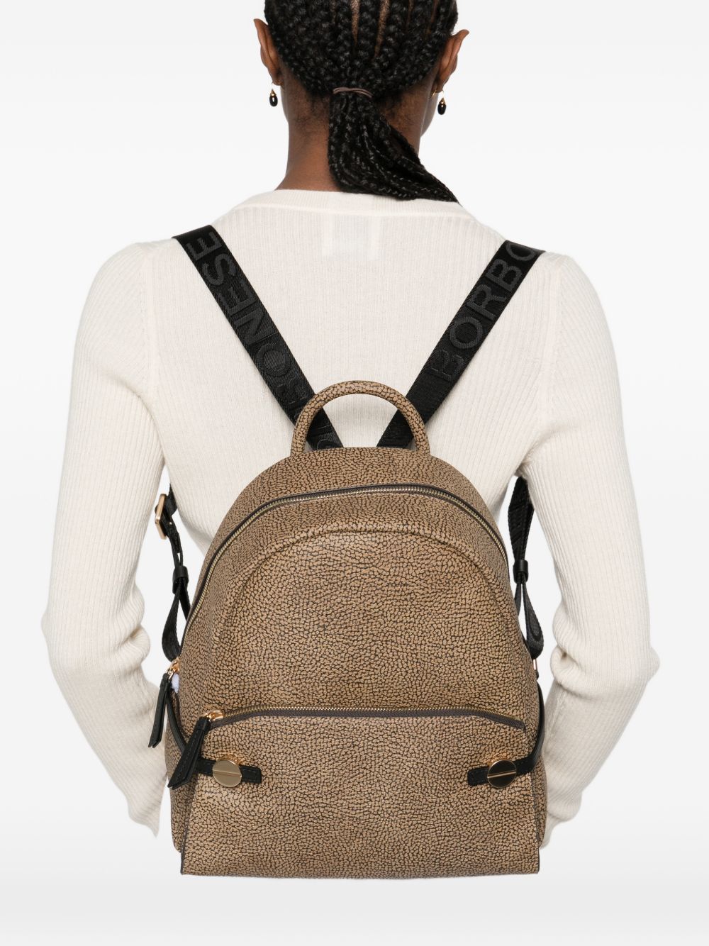 realizzato in tessuto riciclato, spallacci logati regolabili, tasca esterna e chiusura superiore con zip, tasca interna aperta, altezza 30 cm, larghezza 26 cm, profondità 11 cm, 100% poliestere, 100% pelle di vitello