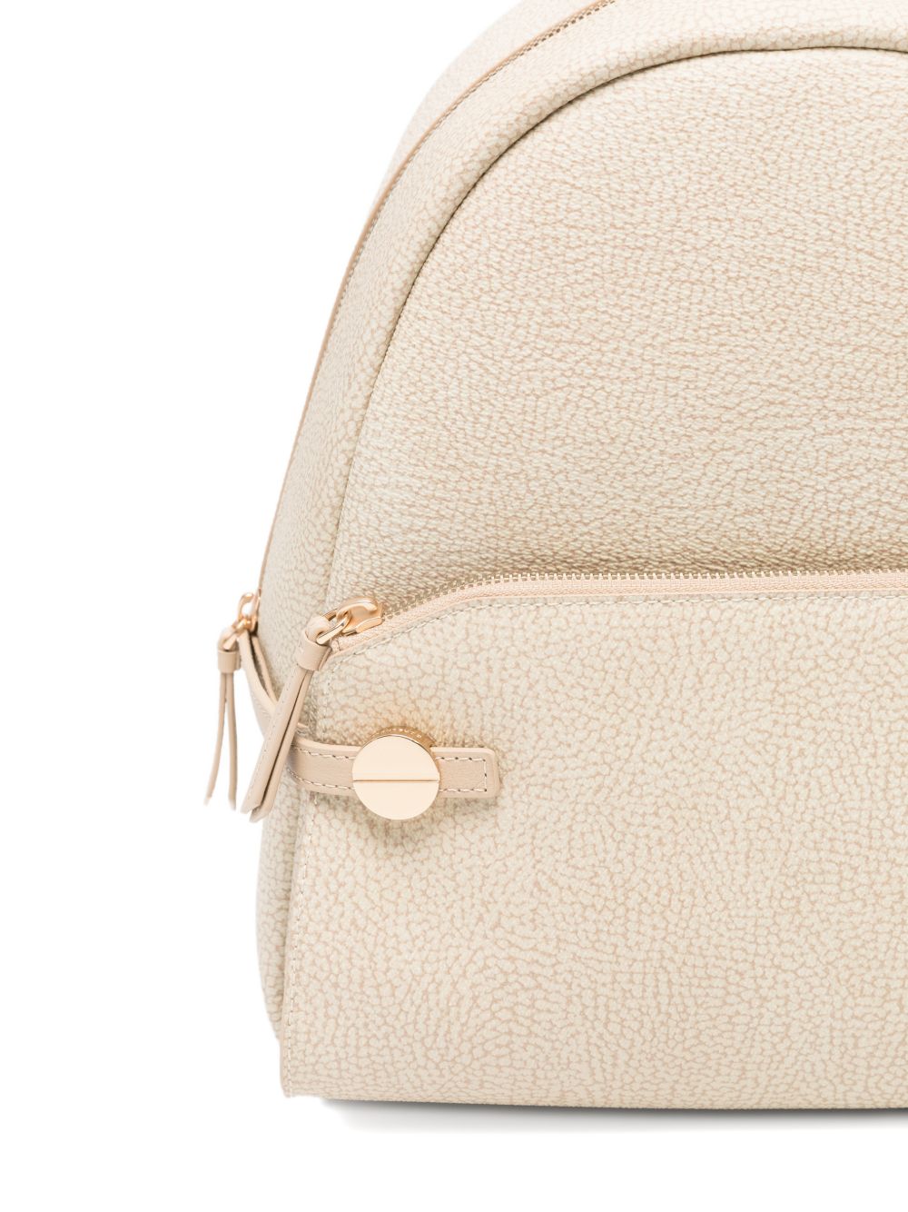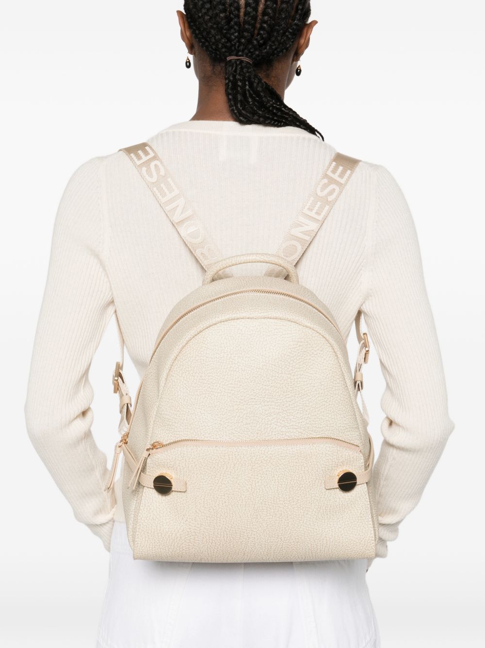 realizzato in tessuto riciclato, spallacci logati regolabili, tasca esterna e chiusura superiore con zip, tasca interna aperta, altezza 30 cm, larghezza 26 cm, profondità 11 cm, 100% poliestere, 100% pelle di vitello