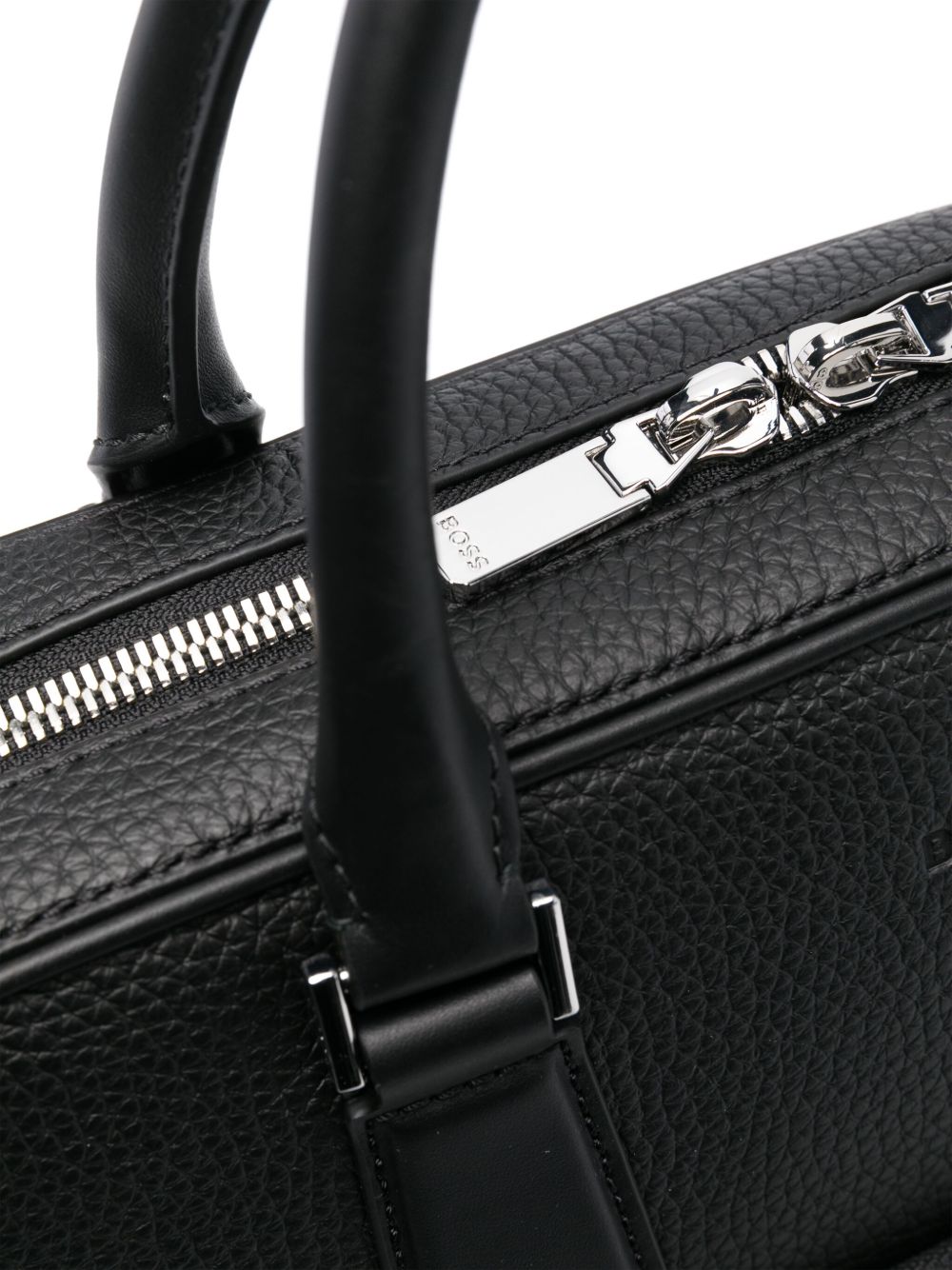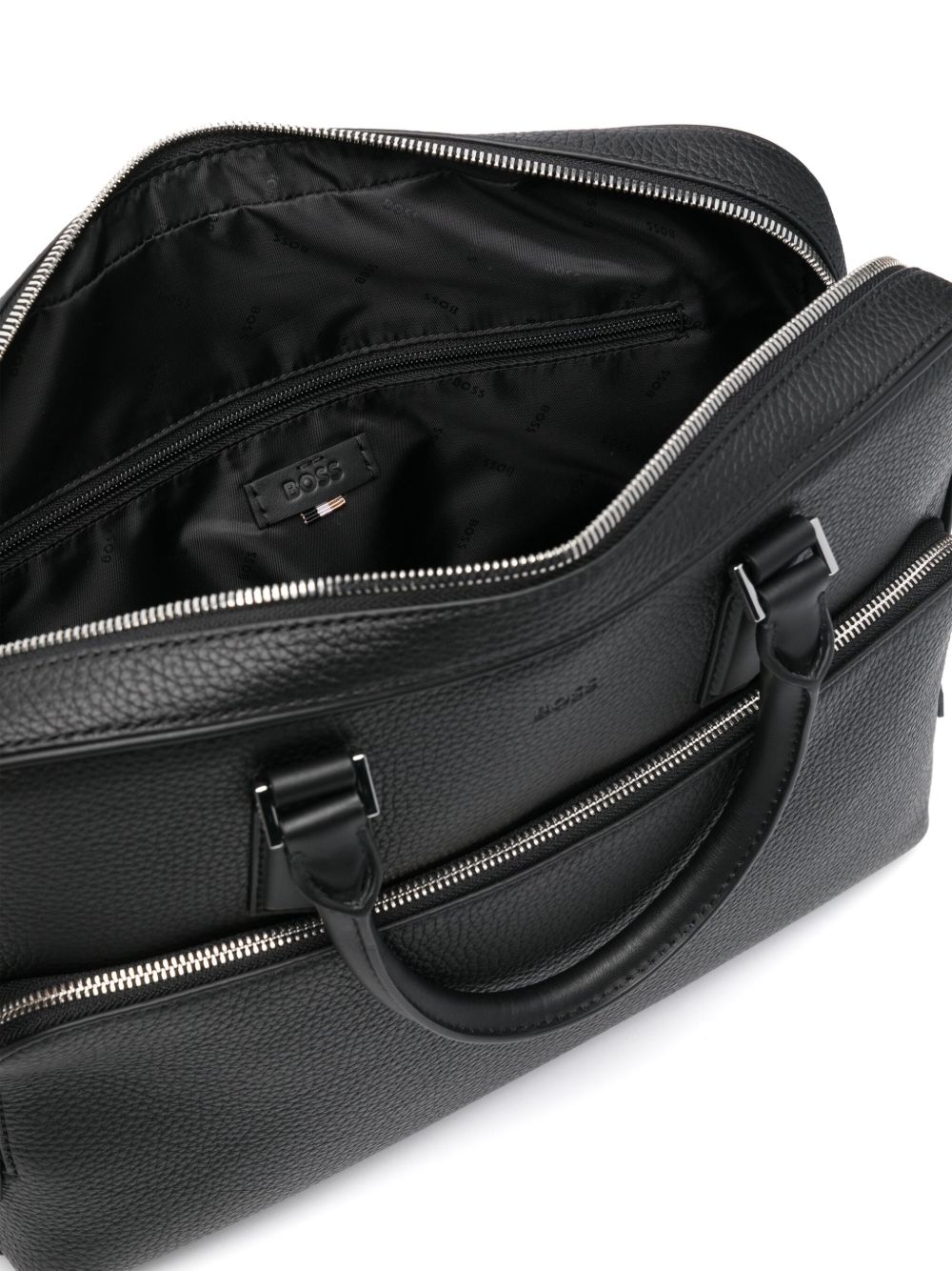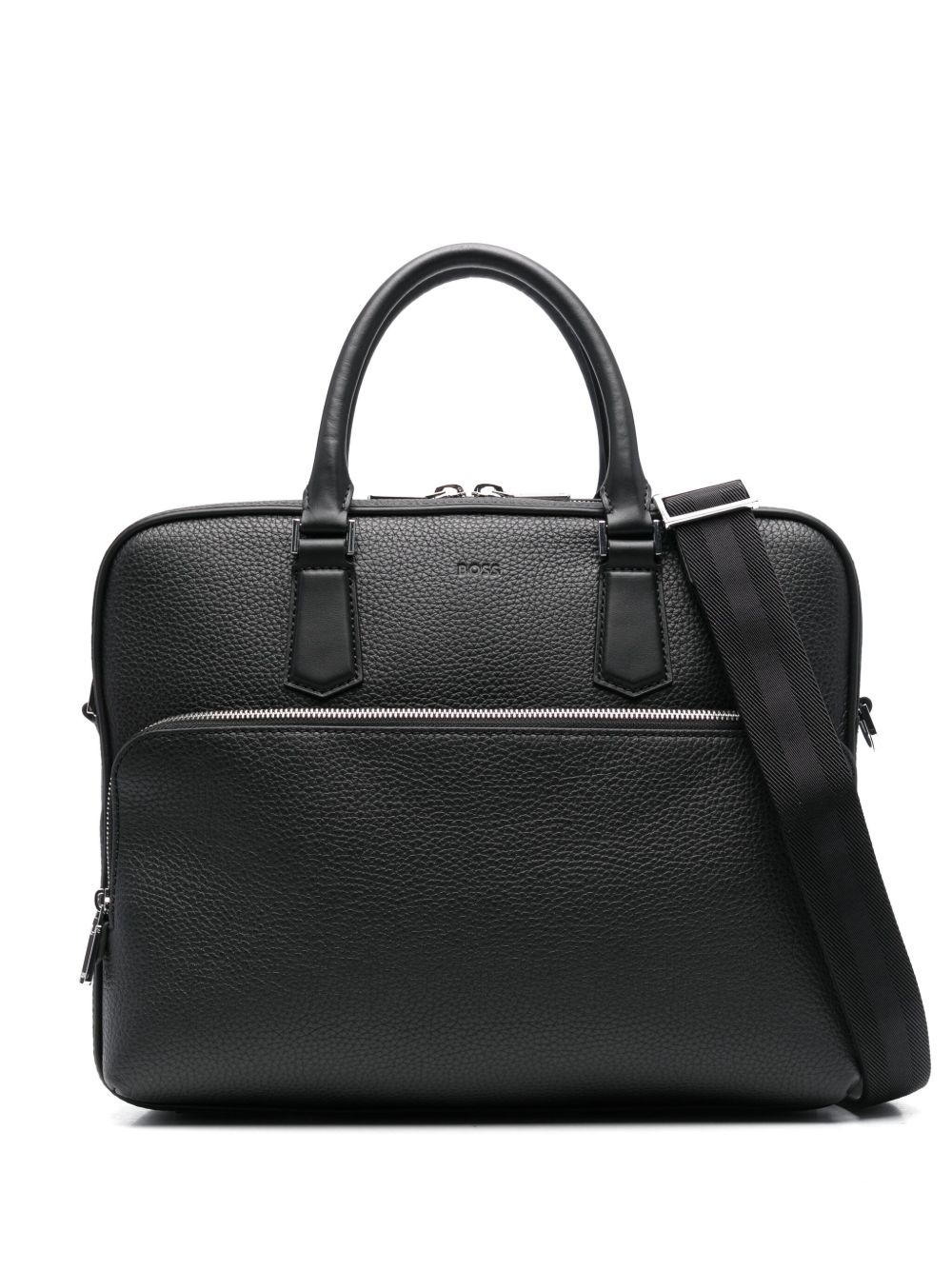 realizzata in vera pelle a trama martellata, logo frontale inciso, tasca frontale con zip, doppio manico, chiusura superiore con zip a giro, tracolla regolabile e removibile, lunghezza 36 cm, altezza 30 cm, profondità 10 cm