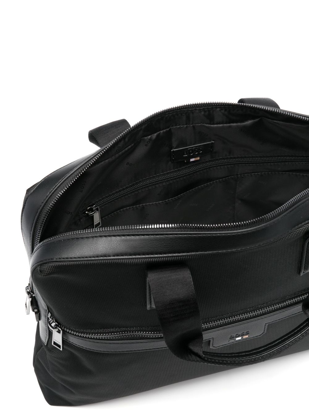 realizzata in tessuto, tasca frontale con zip, chiusura superiore con zip a doppio cursore, tracolla regolabile e removibile, lunghezza 38 cm, altezza 26 cm, profondità 11 cm, manico 11 cm