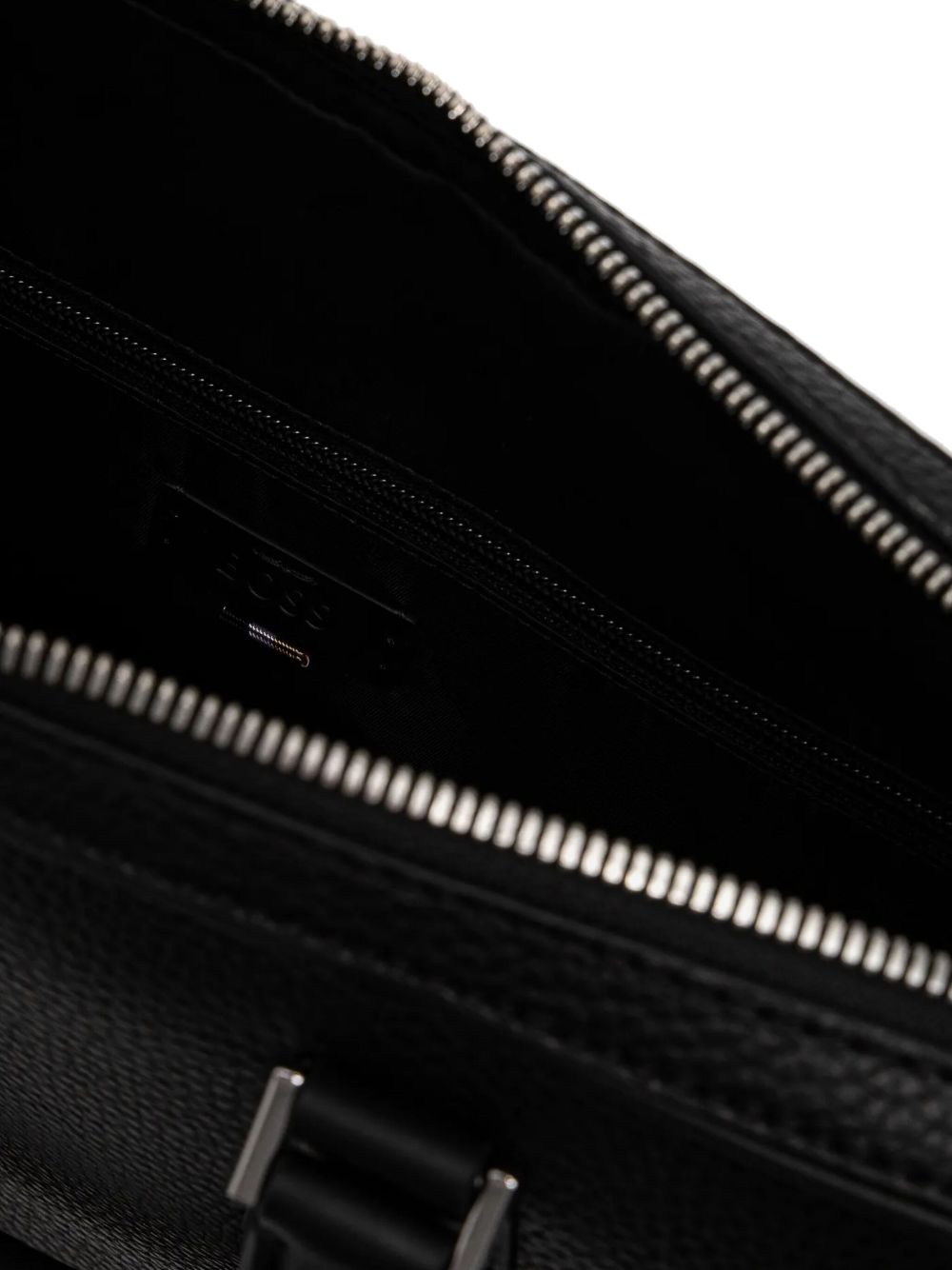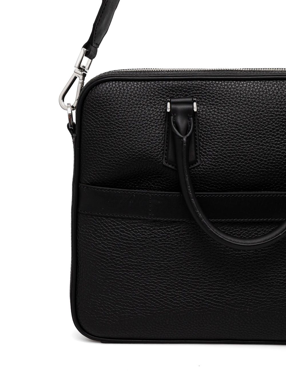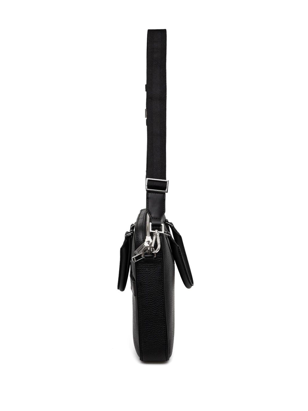 realizzata in vera pelle martellata, dettagli in metallo lucido, chiusura superiore con zip a doppio cursore, tracolla regolabile, lunghezza 37.5 cm, altezza 29 cm, profondità 6 cm