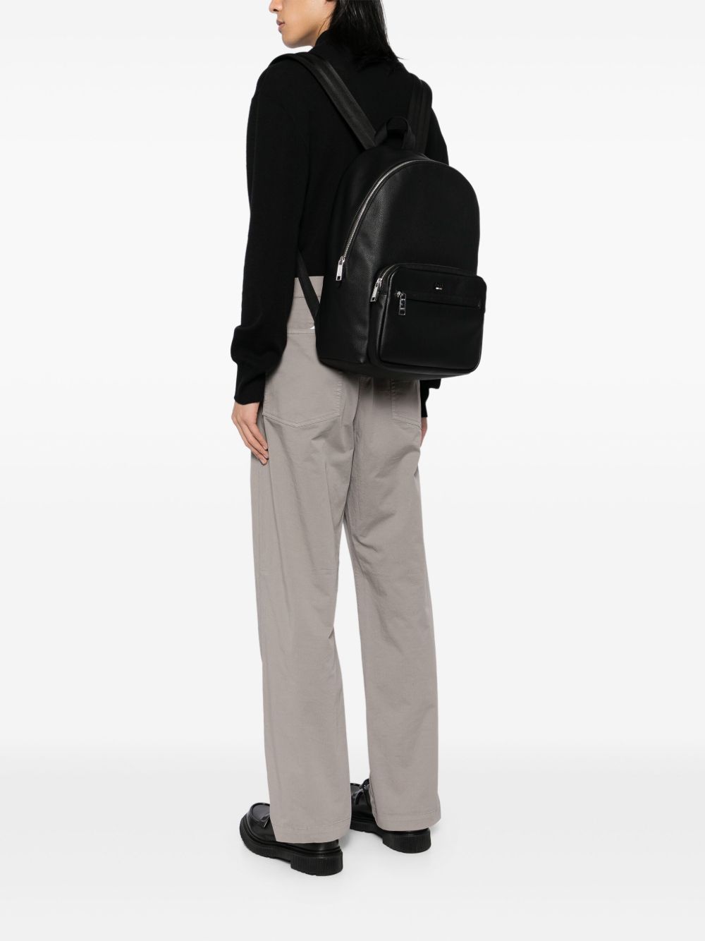 realizzato in ecopelle, logo frontale inciso, tasca frontale con zip, manico singolo, spallacci regolabili, chiusura superiore con zip, tasca interna per laptop, lunghezza 28 cm, altezza 44 cm, profondità 18 cm