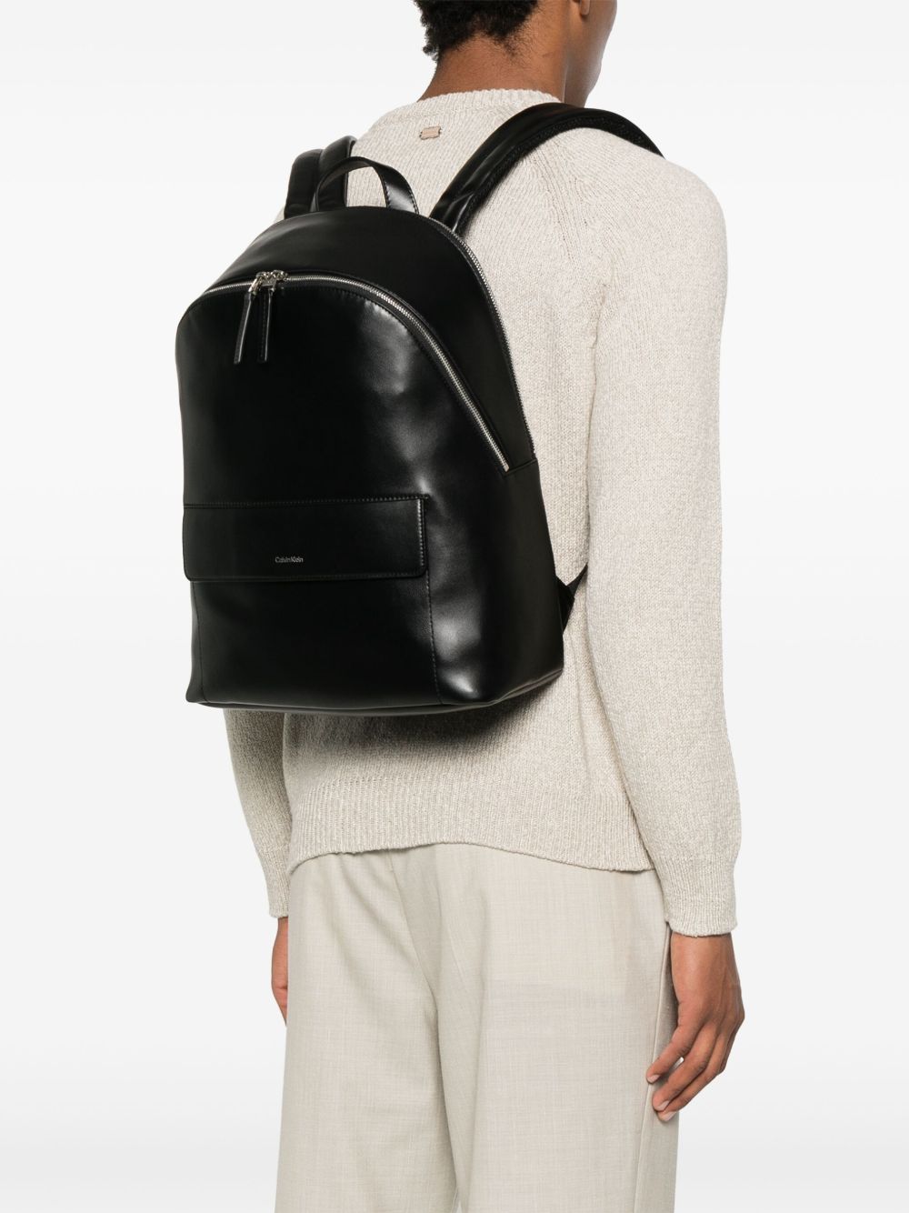 Realizzato in poliestere riciclato, chiusura superiore con zip, tasca interna con cerniera, due scomparti, tasca frontale, spallacci imbottiti, manico superiore, logo in metallo davanti, 51% poliestere riciclato, 49% poliuretano