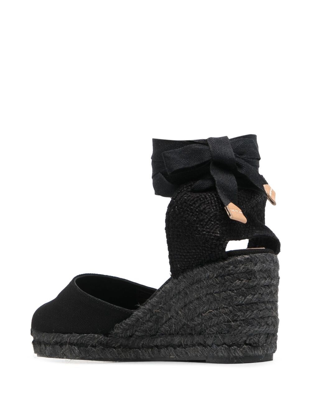 punta realizzata in cotone, soletta imbottita, zeppa in juta da 7 cm, chiusura alla caviglia a nastri