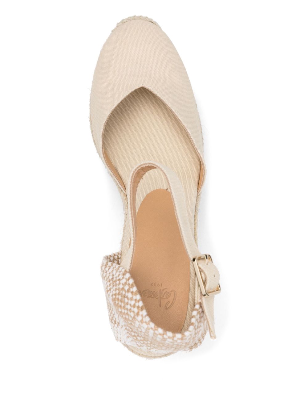 punta realizzata in cotone, soletta imbottita, zeppa in juta da 9 cm, chiusura alla caviglia con laccino regolabile