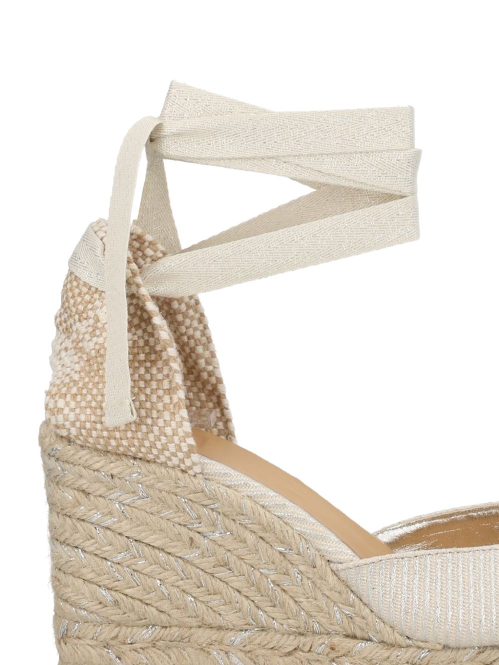 realizzata in lino metallizzato, soletta imbottita, chiusura a nastro alla caviglia, zeppa in juta alta 11 cm con doppia piattaforma