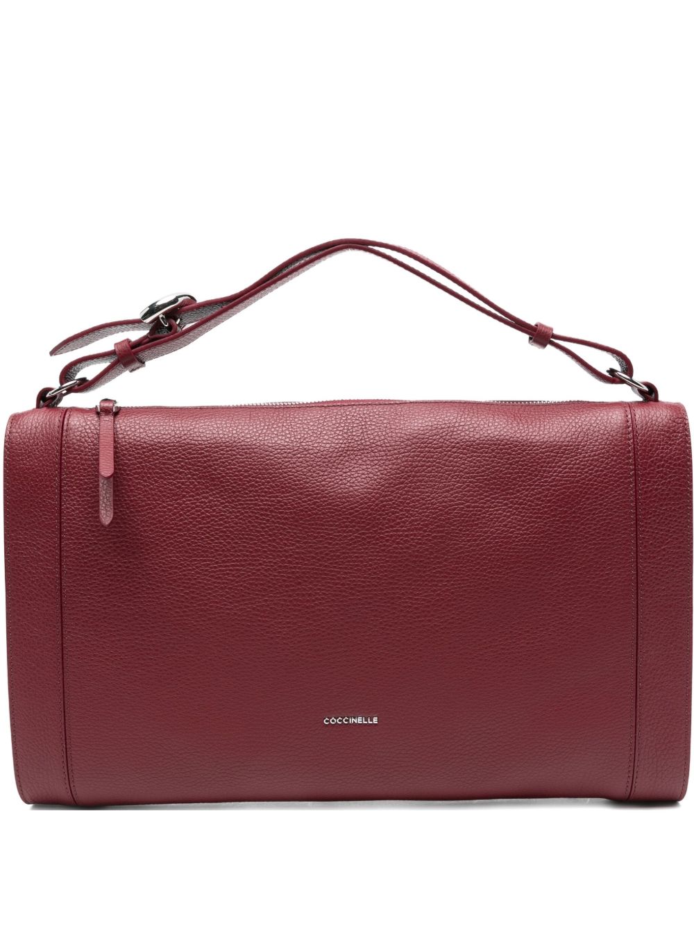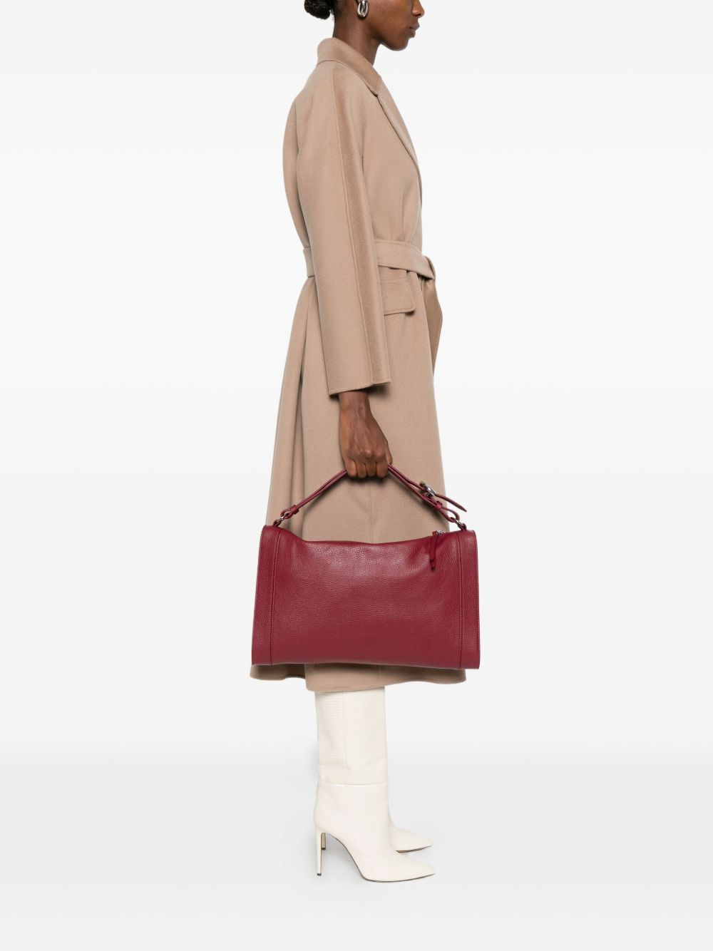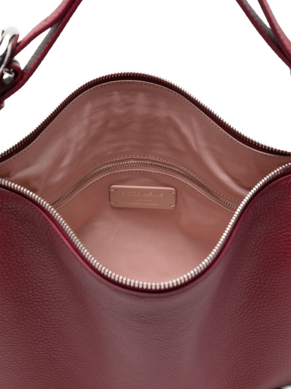 realizzata in pelle, chiusura superiore con zip, manico regolabile, interno in tessuto, scritta con logo color oro davanti, altezza 12 cm, lunghezza 24 cm, profondità 3 cm