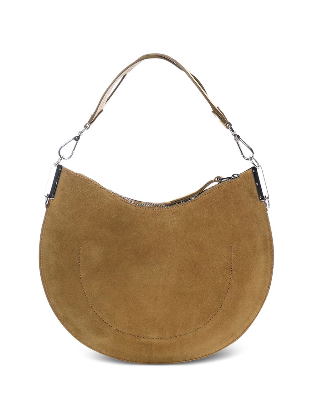 Borsa Coccinelle da donna a mezza luna in suede beige, caratterizzata da una superficie morbida e vellutata che valorizza la linea pulita del modello.