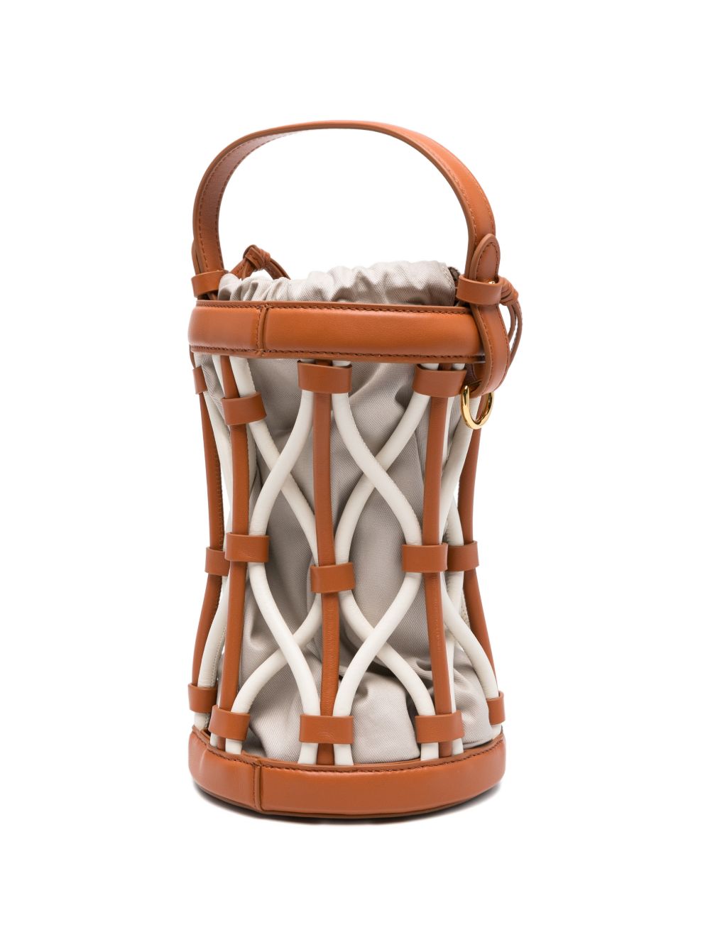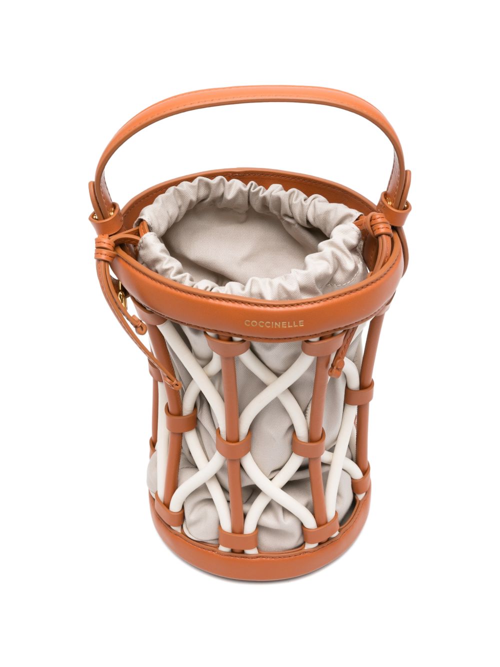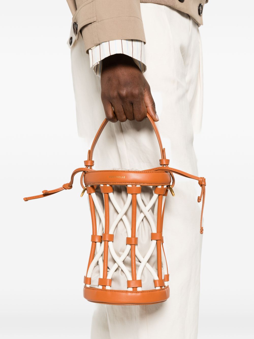 Borsa Coccinelle modello secchiello in pelle arancione, caratterizzata da una forma morbida e contemporanea.