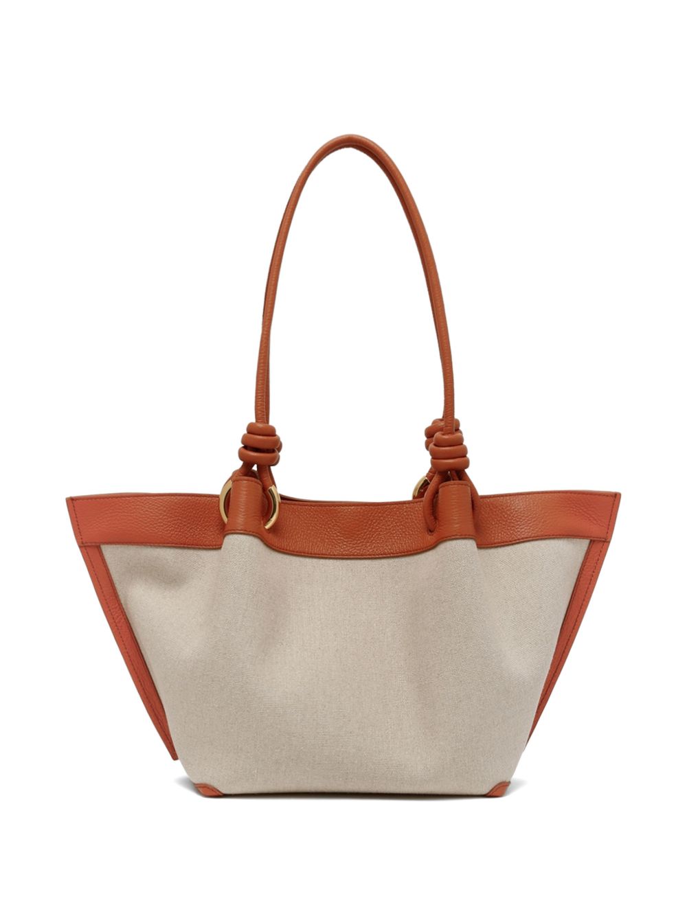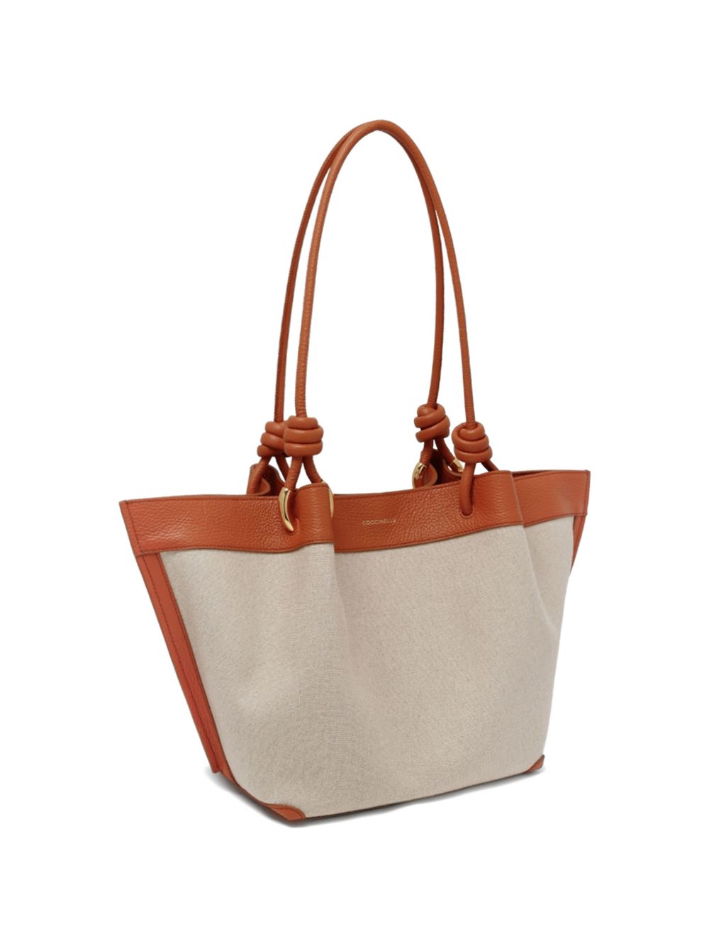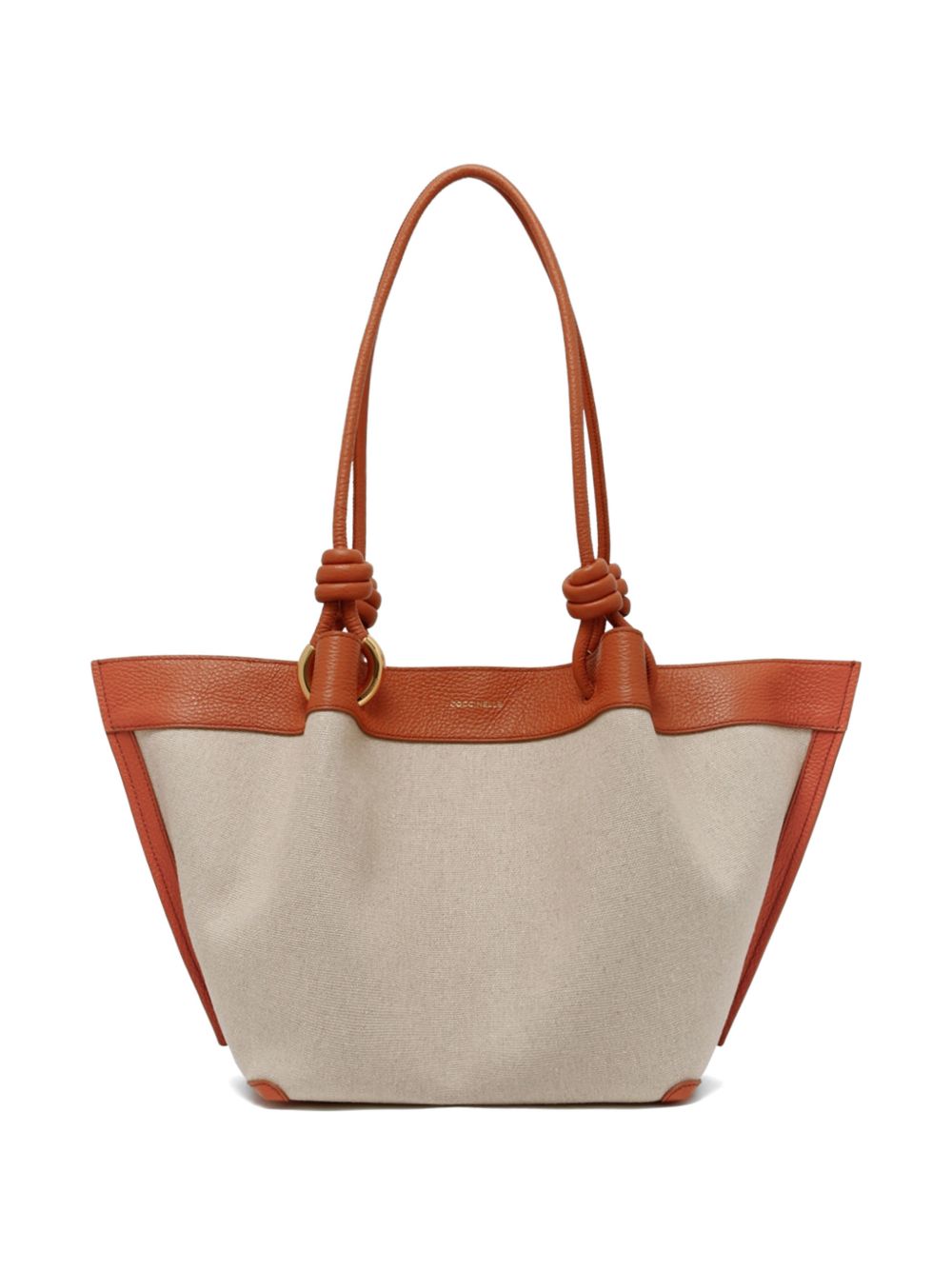 Borsa shopping Coccinelle in canvas color sabbia con dettagli arancio a contrasto, caratterizzata da un design capiente e leggero perfetto per lutilizzo quotidiano.
