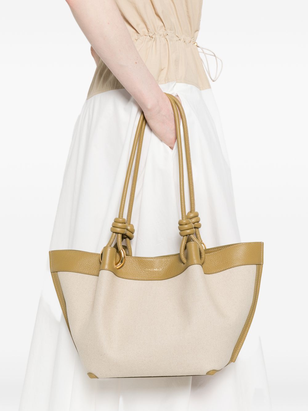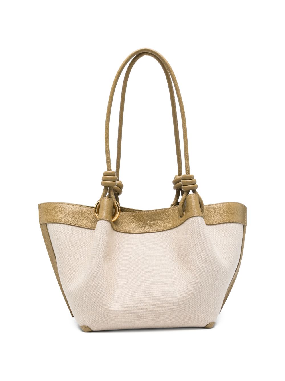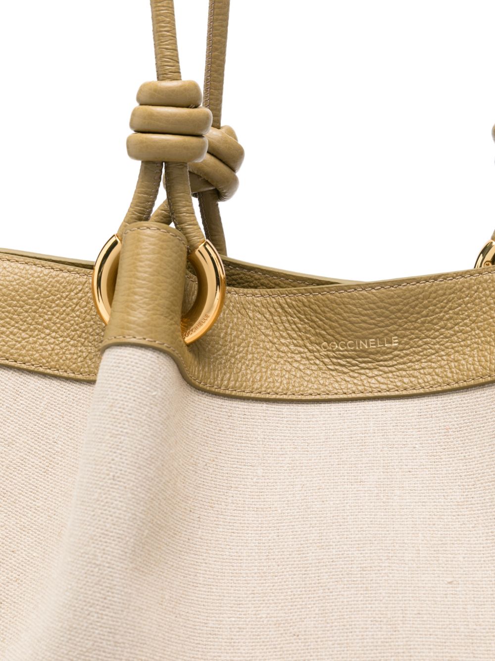 Borsa shopping Coccinelle in canvas sabbia con dettagli beige, perfetta per chi cerca un accessorio capiente dal look naturale e raffinato.