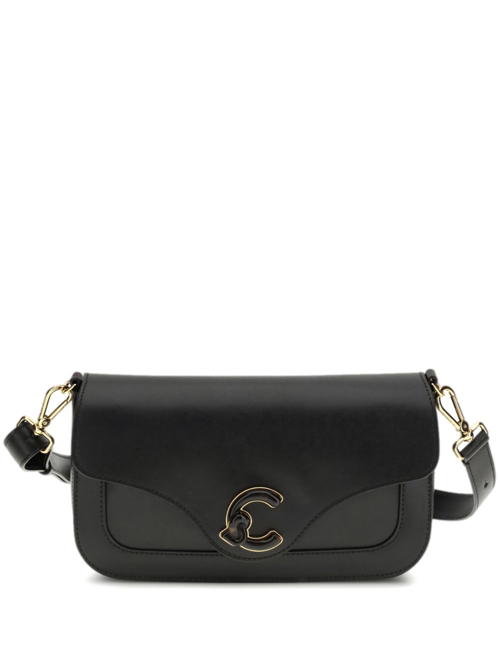Borsa Coccinelle a tracolla in pelle nera con catena e dettaglio fibbia, caratterizzata da un design elegante e contemporaneo.