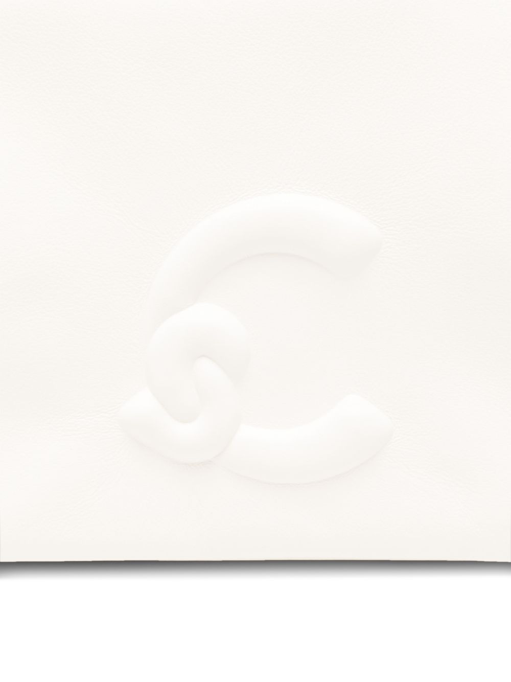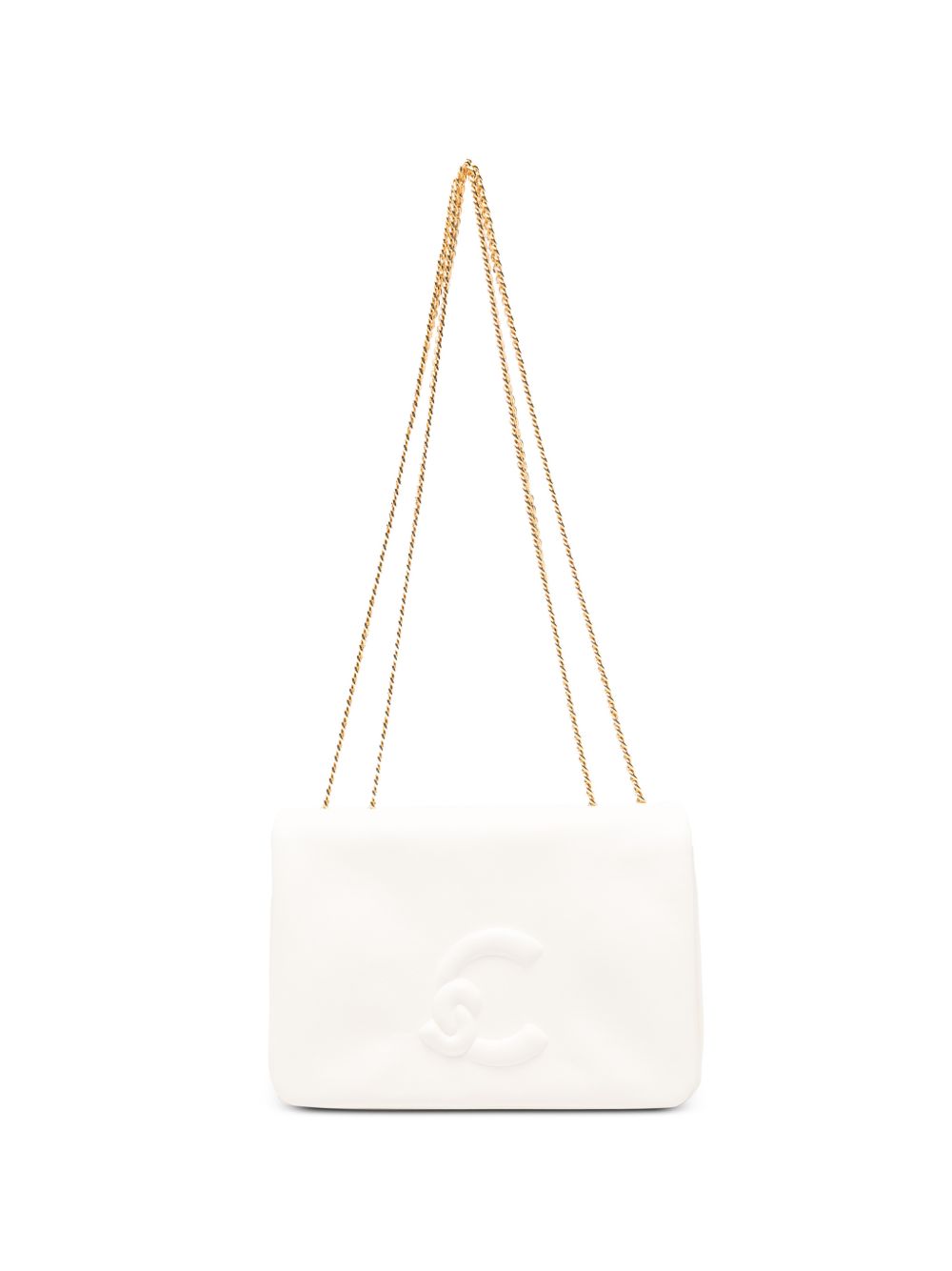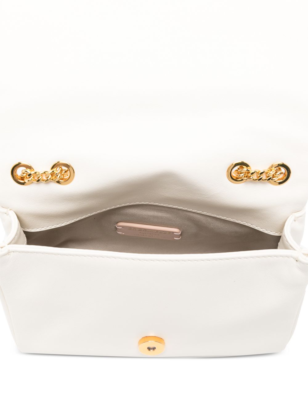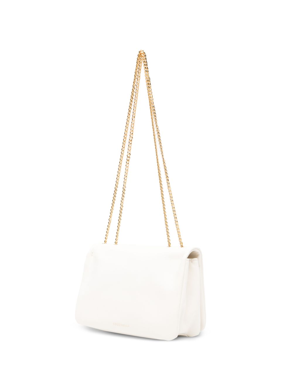 Borsa Coccinelle a tracolla in pelle color perla con catena, compatta ed elegante.