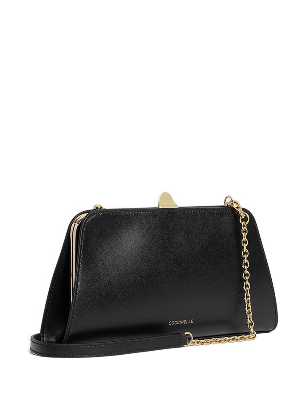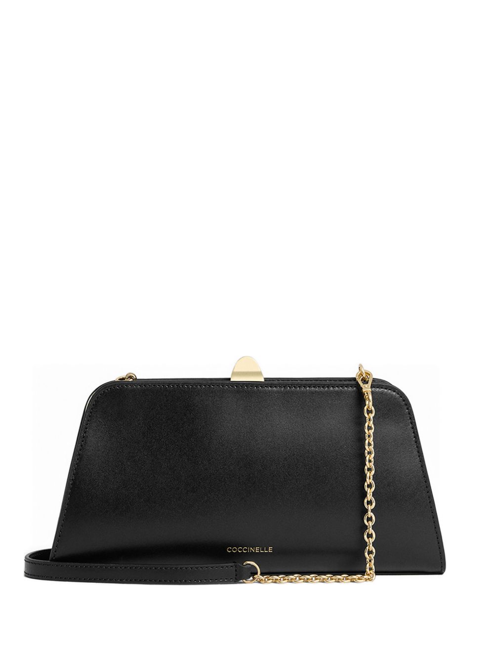 Pochette Coccinelle in pelle nera con catena, perfetta per la sera o per occasioni più eleganti.