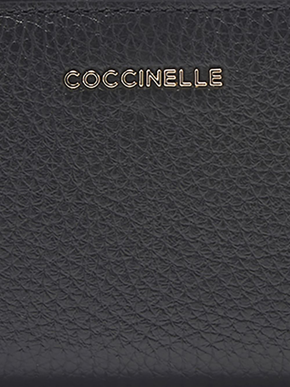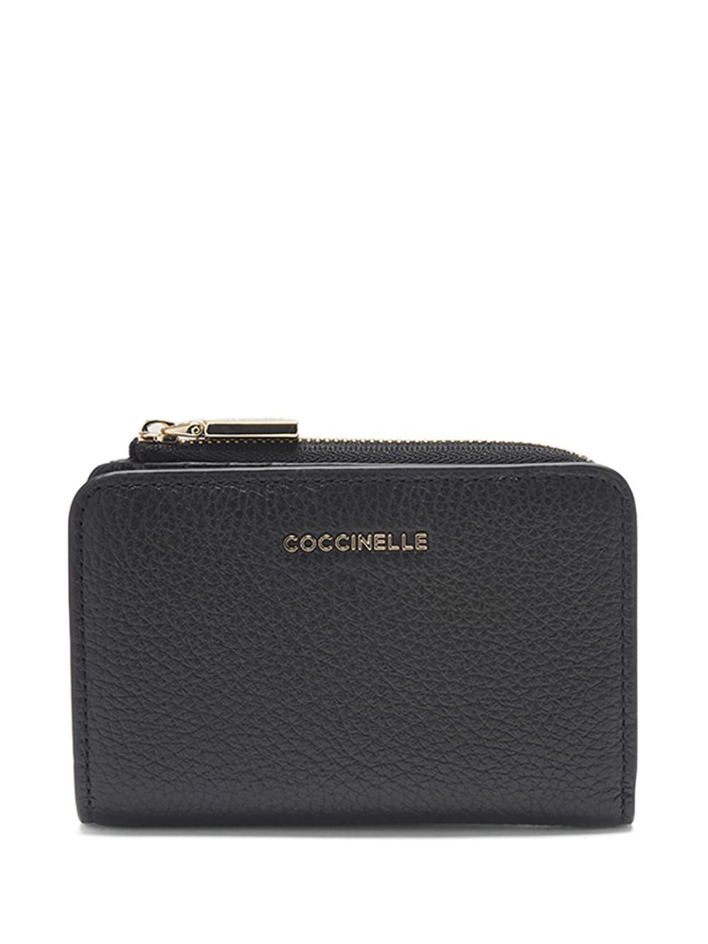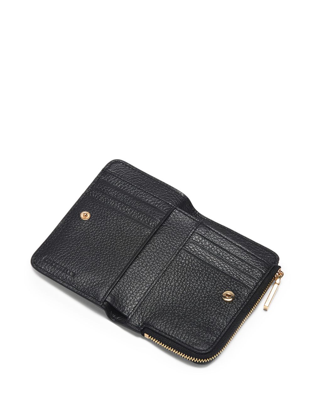 realizzato in pelle con grana, logo stampato color oro, chiusura con bottone a pressione, porta monete con chiusura a zip, sei porta carte, portabanconote, due scomparti interni, misure 13 x 9 (cm), 100 grammi, 100% pelle