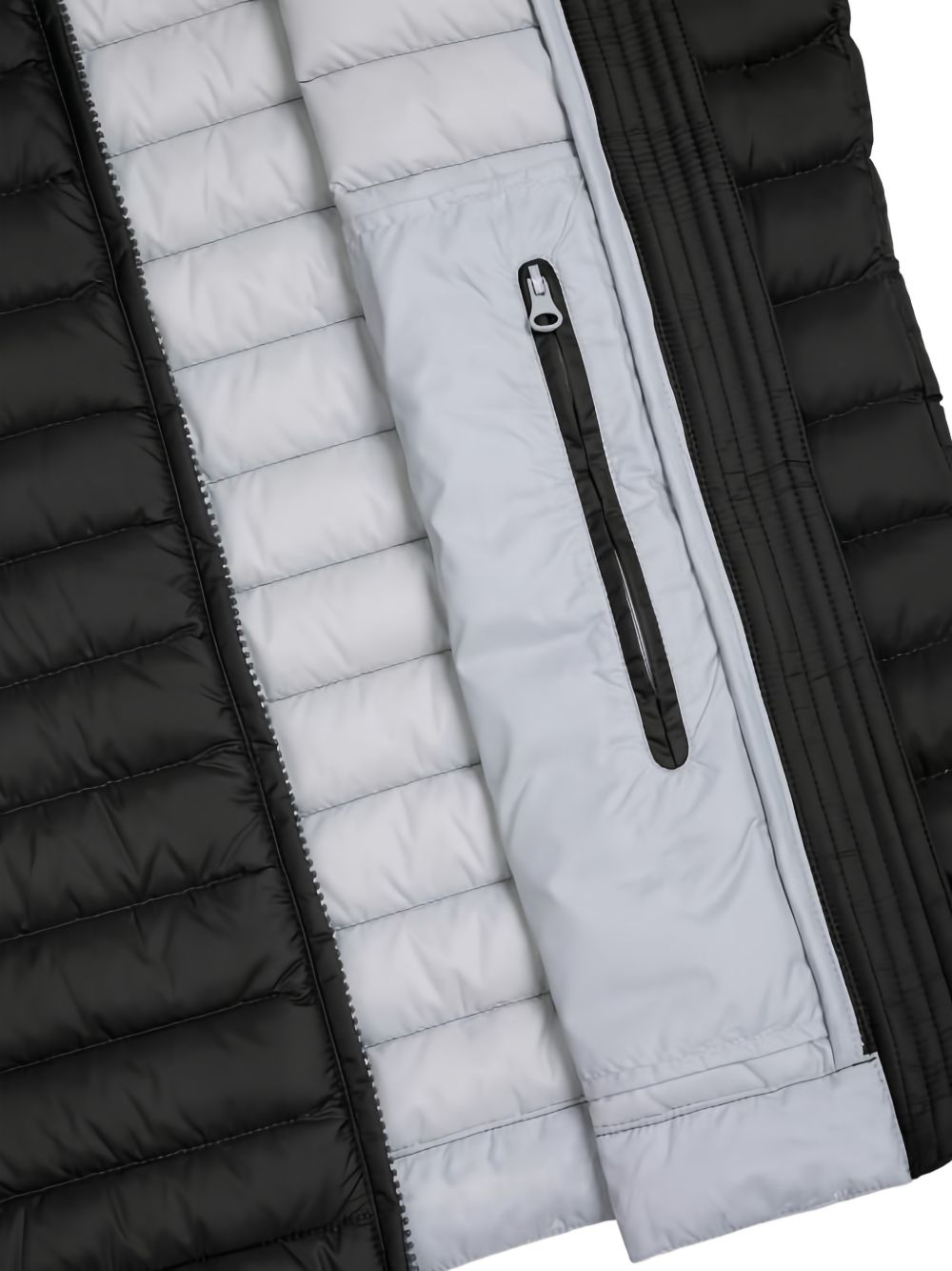 Realizzato in poliammidica, imbottitura in piuma d'anatra, chiusura frontale con zip a doppio cursore, due tasche davanti e una interna con cerniera, patch logo sulla manica sinistra, fondo regolabile con coulisse, nastro elastico sul giromanica, fondo regolabile con coulisse, vestibilità regolare.