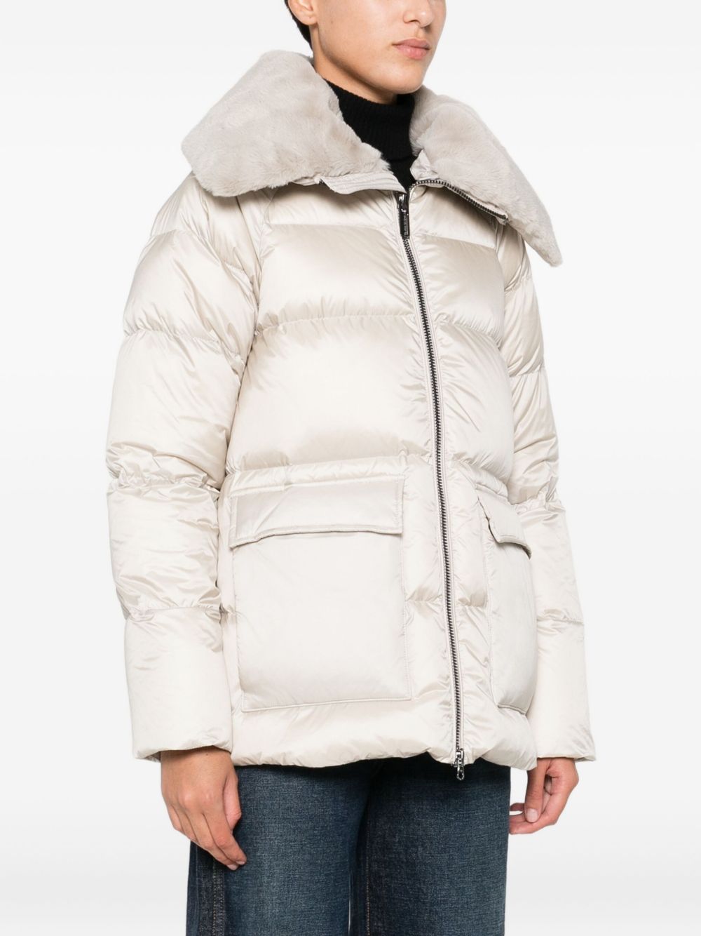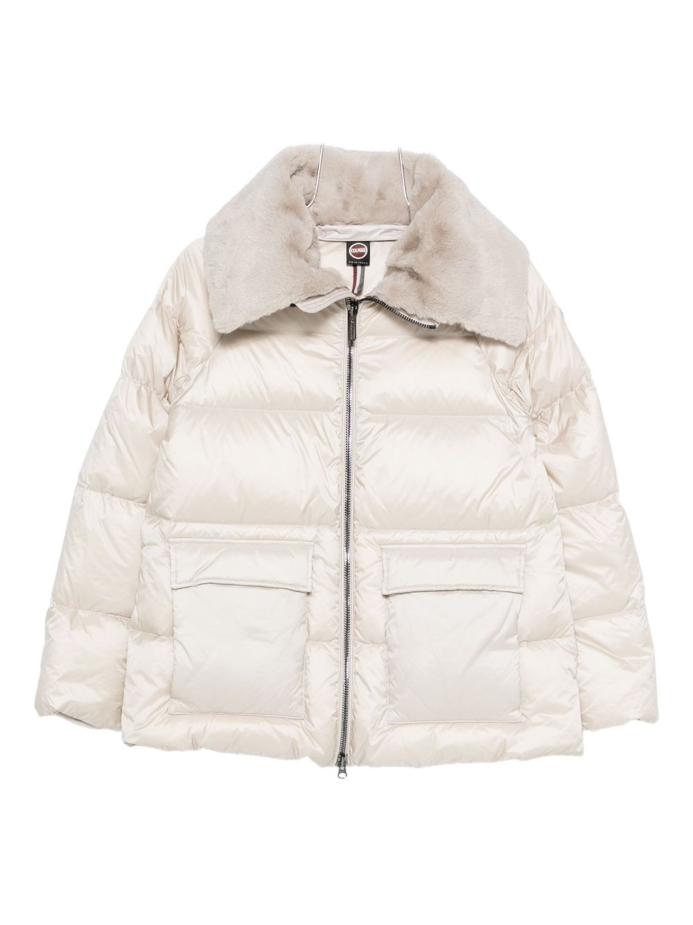 realizzato in materiale riciclato idrorepellente con imbottitura in piuma naturale, effetto semilucido, collo in pelliccia sintetica removibile, tasche frontali con pattina e bottone a pressione nascosto, chiusura frontale con zip a doppio cursore, polsini in maglia a costina, patch logato sulla manica sinistra, vestibilità regolare, esterno 100% poliammidica, imbottitura 90% piumino d'anatra 10% piuma d'anatra