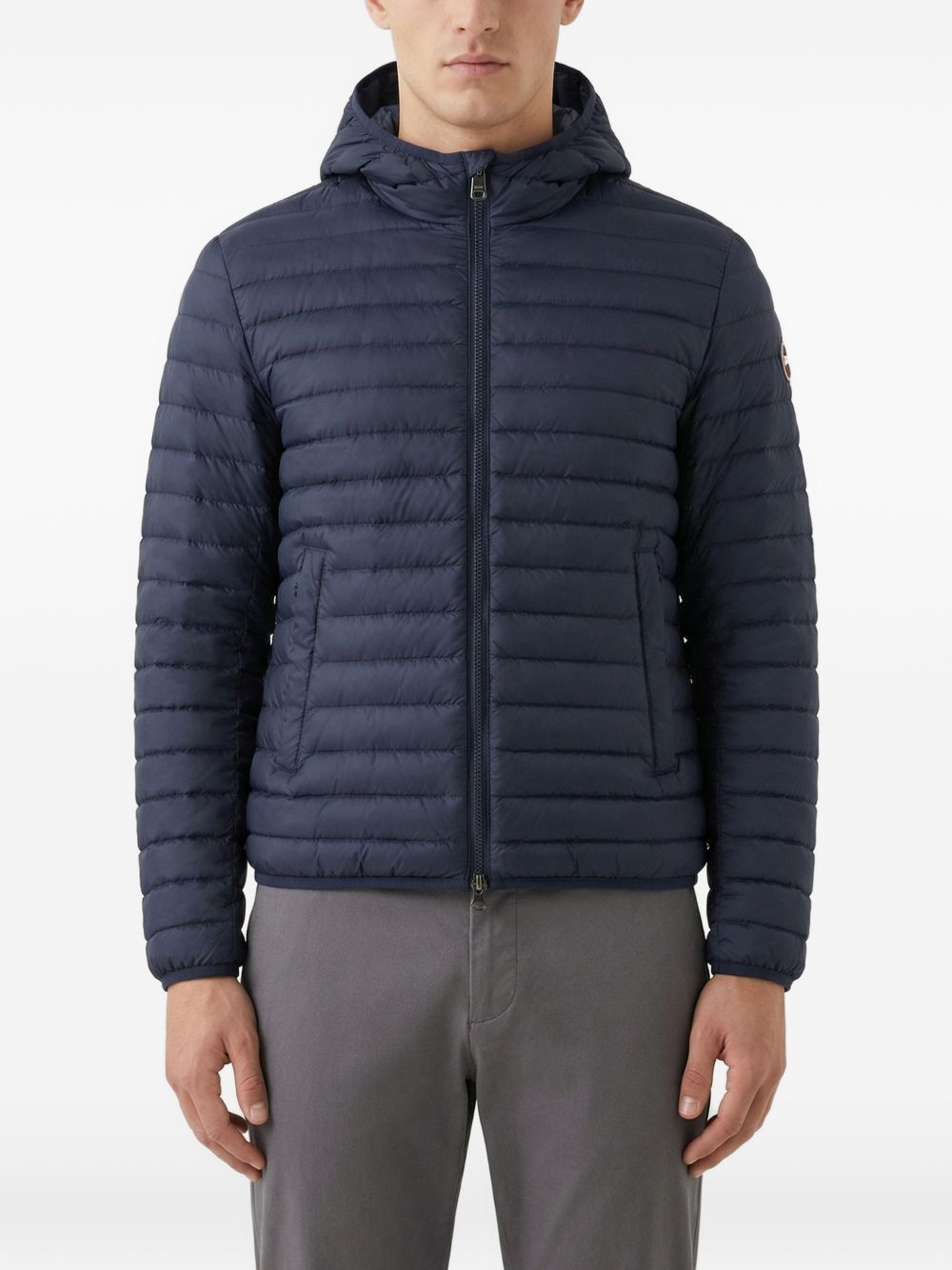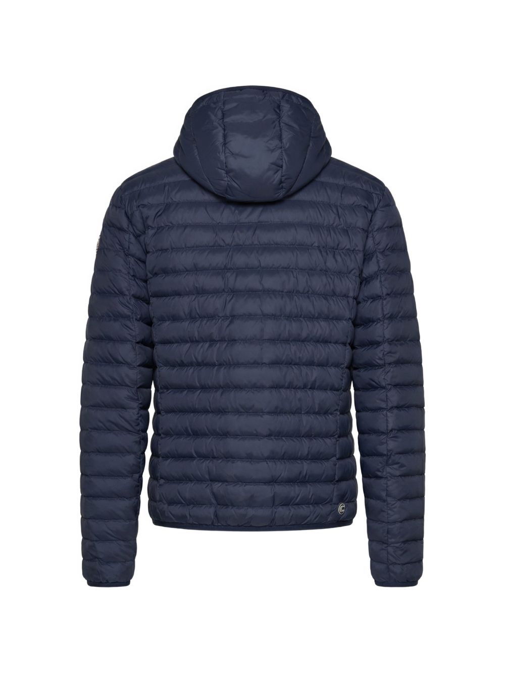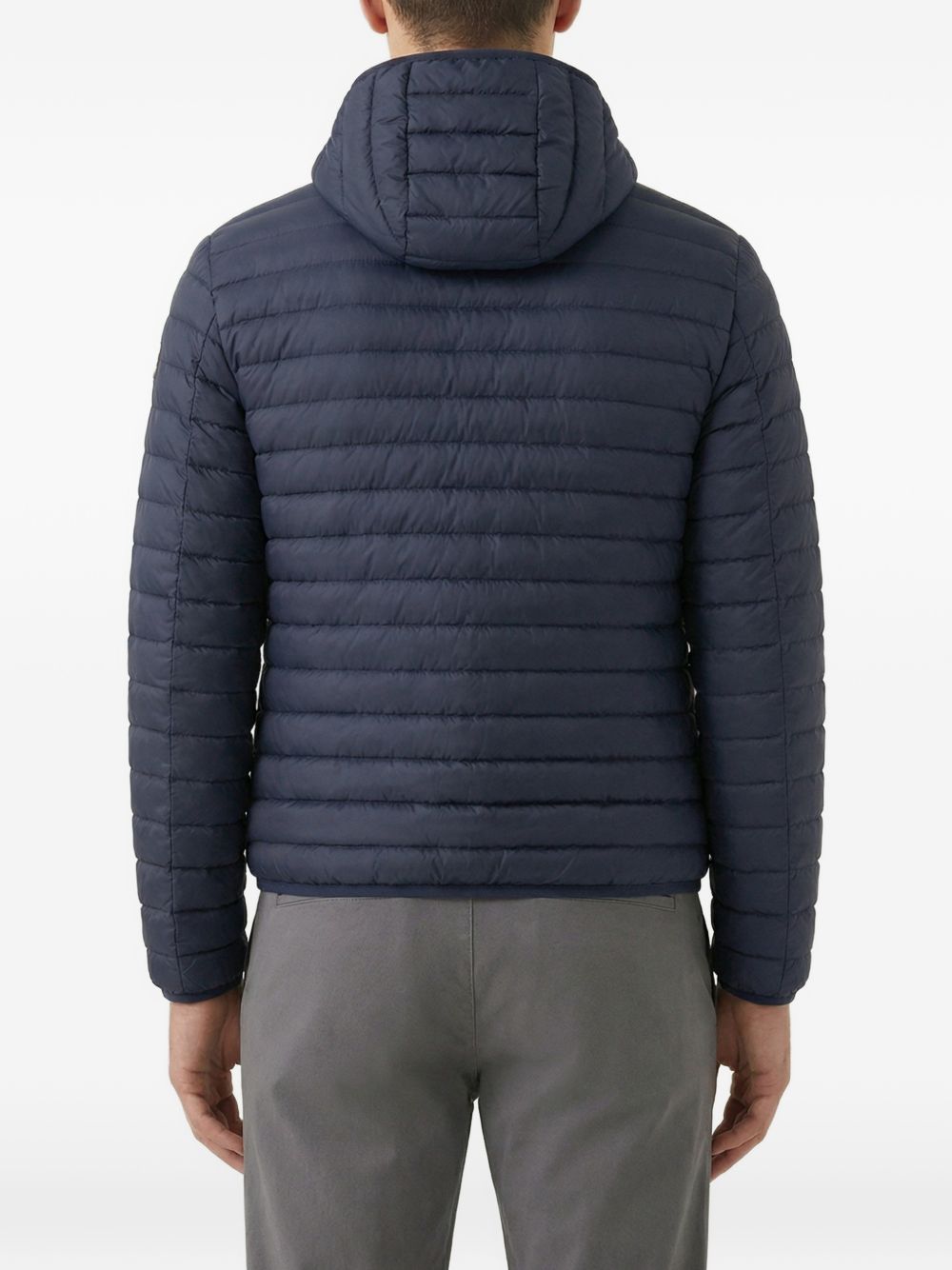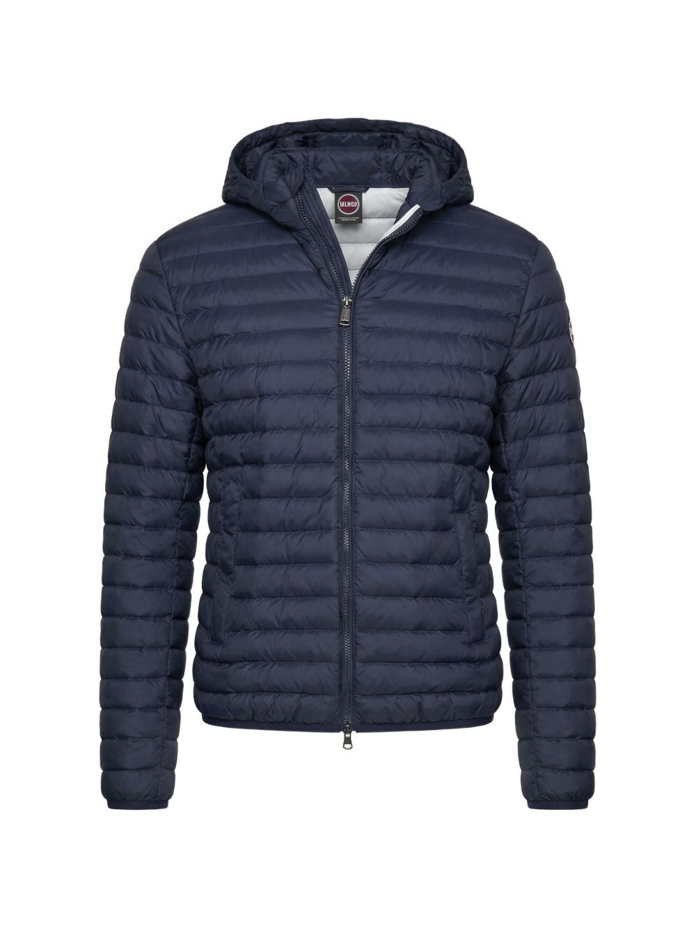 Realizzato in poliammidica, cappuccio fisso, chiusura frontale con zip a doppio cursore, due tasche davanti e tasca interna con cerniera, polsini e fondo con nastro elastico, imbottitura in piuma naturale, patch logo sulla manica sinistra e in fondo sul retro, vestibilità regolare.