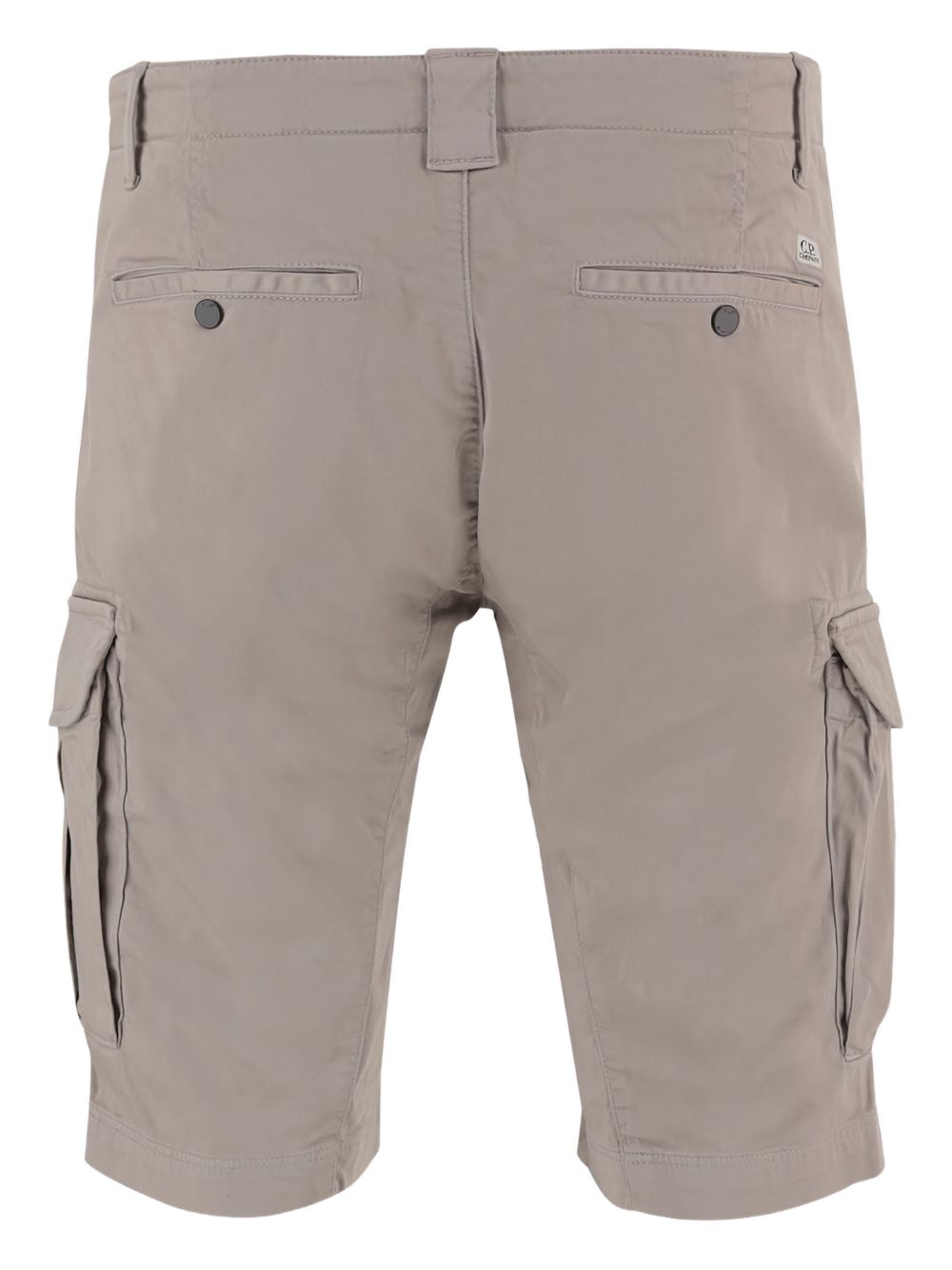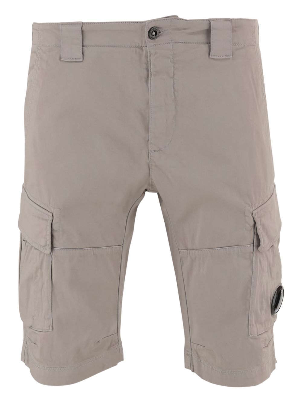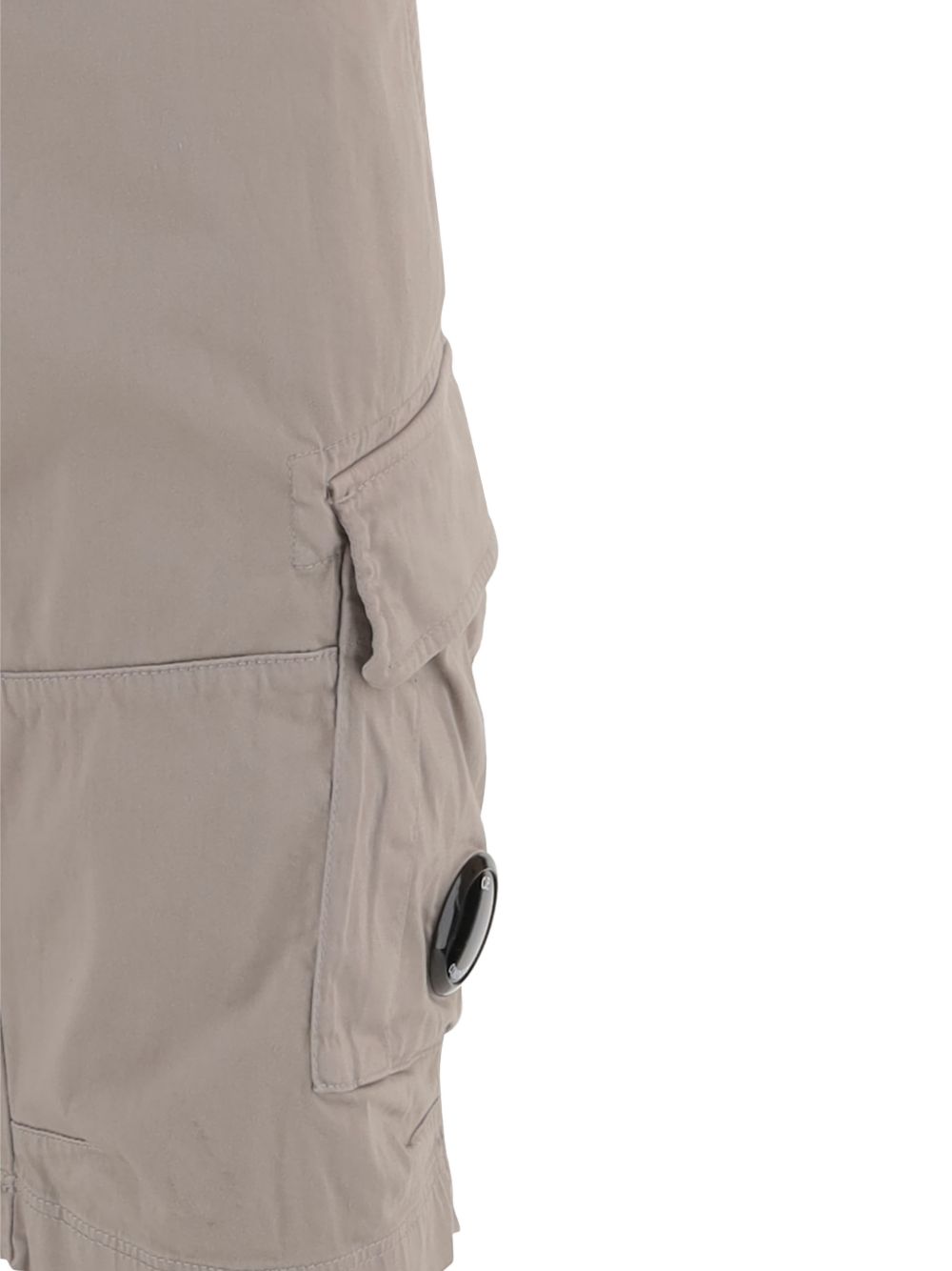realizzato in raso di cotone stretch, tasche cargo con iconica lente, vita con passanti, chiusura con zip e bottone, vestibilità regolare