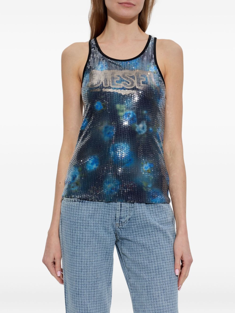 Realizzato in poliammide, spalline sottili, scollo ampio, scritta logo davanti, applicazione paillettes all-over, 82% poliammide, 18% elastam