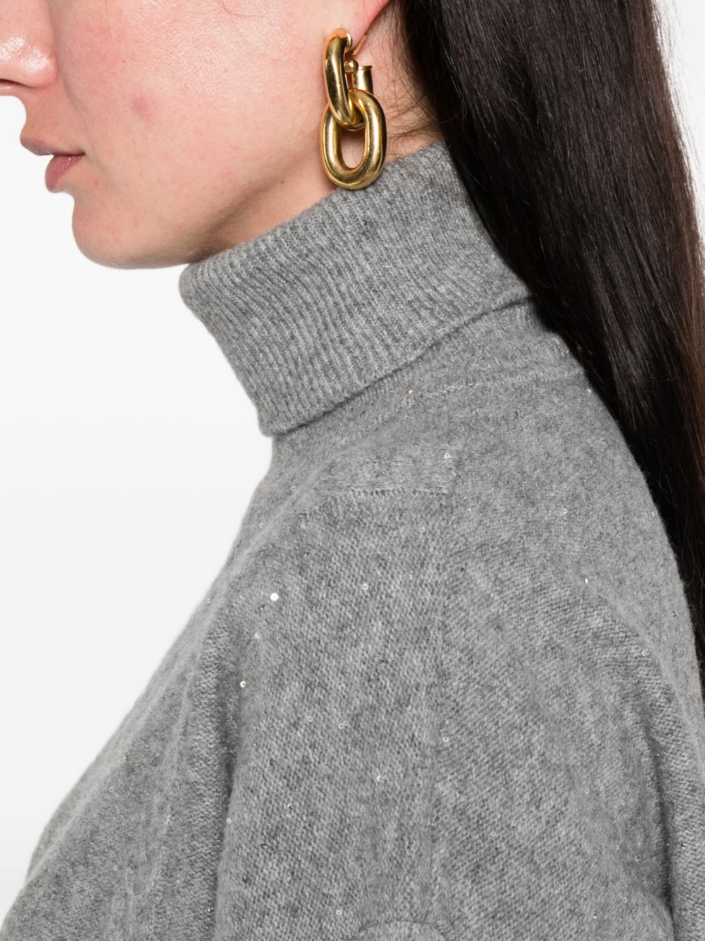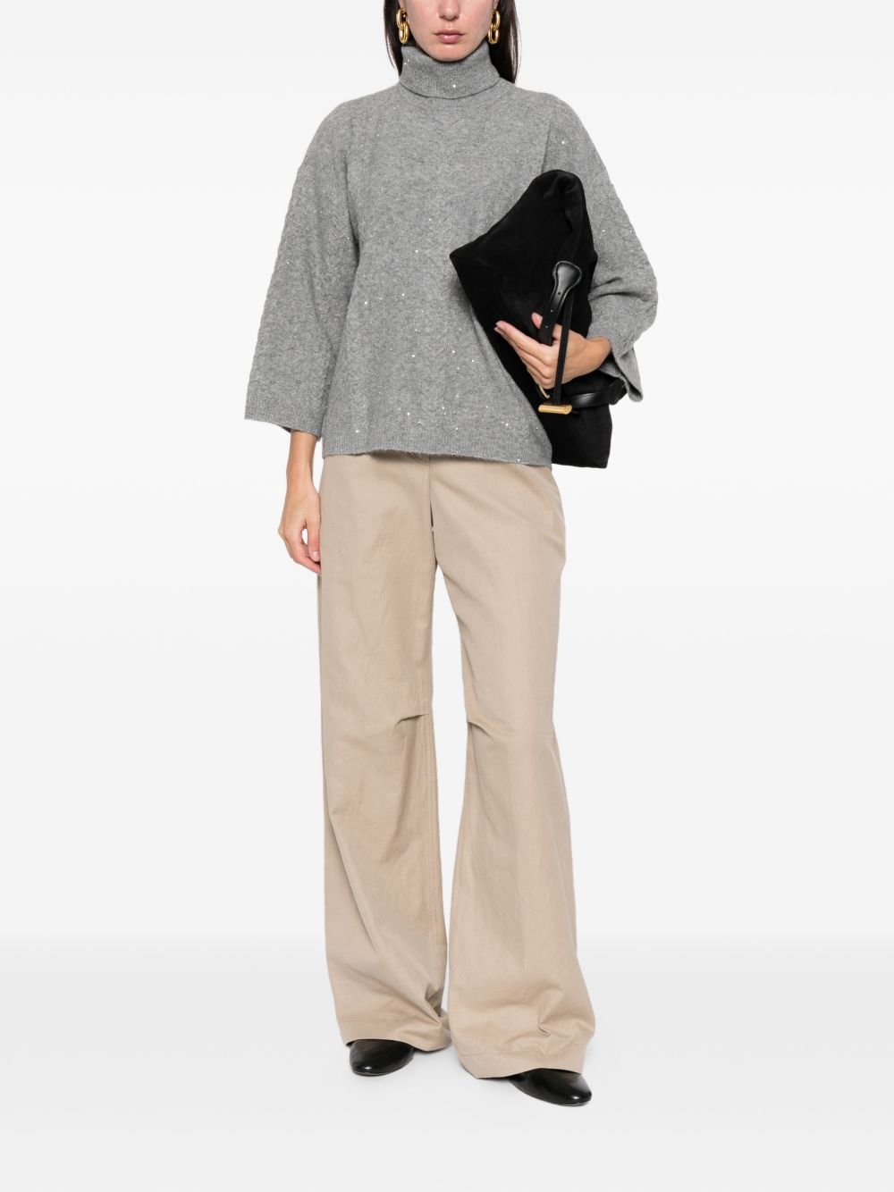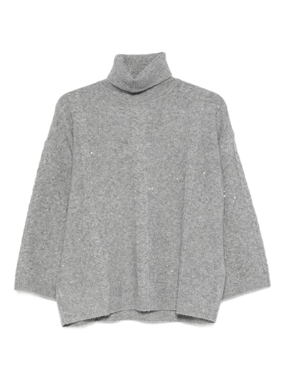 Realizzata in poliestere, lavorazione a trecce di fronte, collo fondo e polsini a costine, collo alto, applicazione paillettes, vestibilità ampia, 72% poliestere, 20% acrilica, 6% lana, 2% elastan