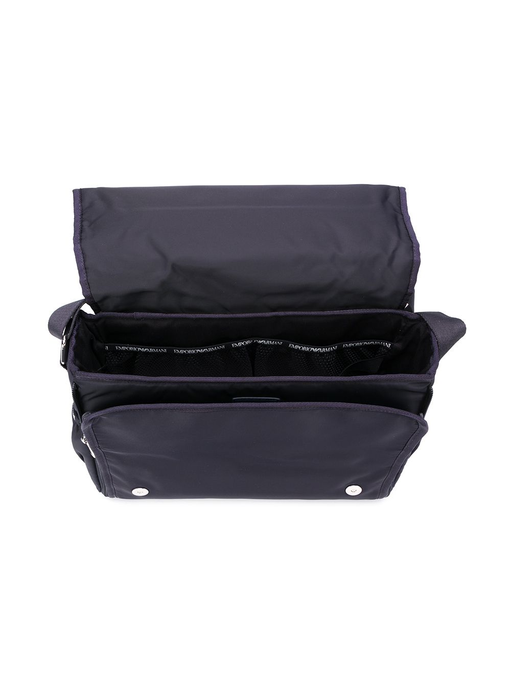 dettaglio applicazione logo con placca, battente nella parte superiore con chiusura magnetica, tracolla regolabile, tasche laterali, tasca interna a soffietto, larghezza 37cm, altezza 25cm, profondità 13cm, tracolla 65cm, 100% nylon