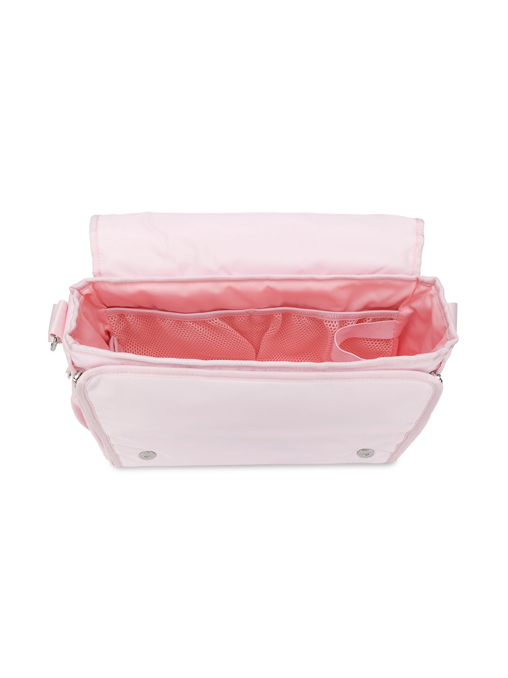 dettaglio applicazione logo con placca, battente nella parte superiore con chiusura magnetica, tracolla regolabile, tasche laterali, tasca interna a soffietto, larghezza 37cm, altezza 25cm, profondità 13cm, tracolla 65cm, 100% nylon