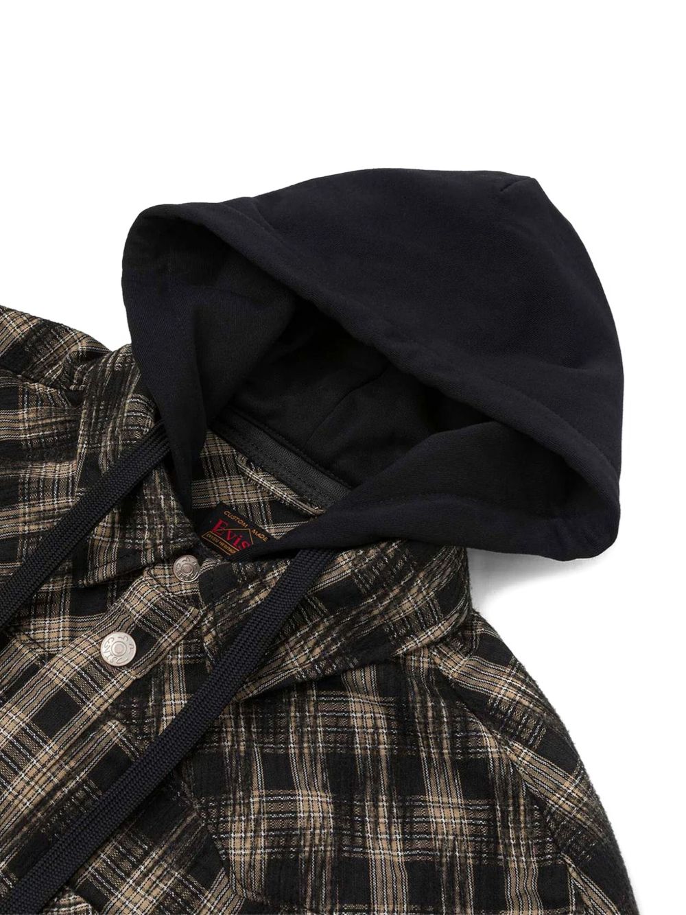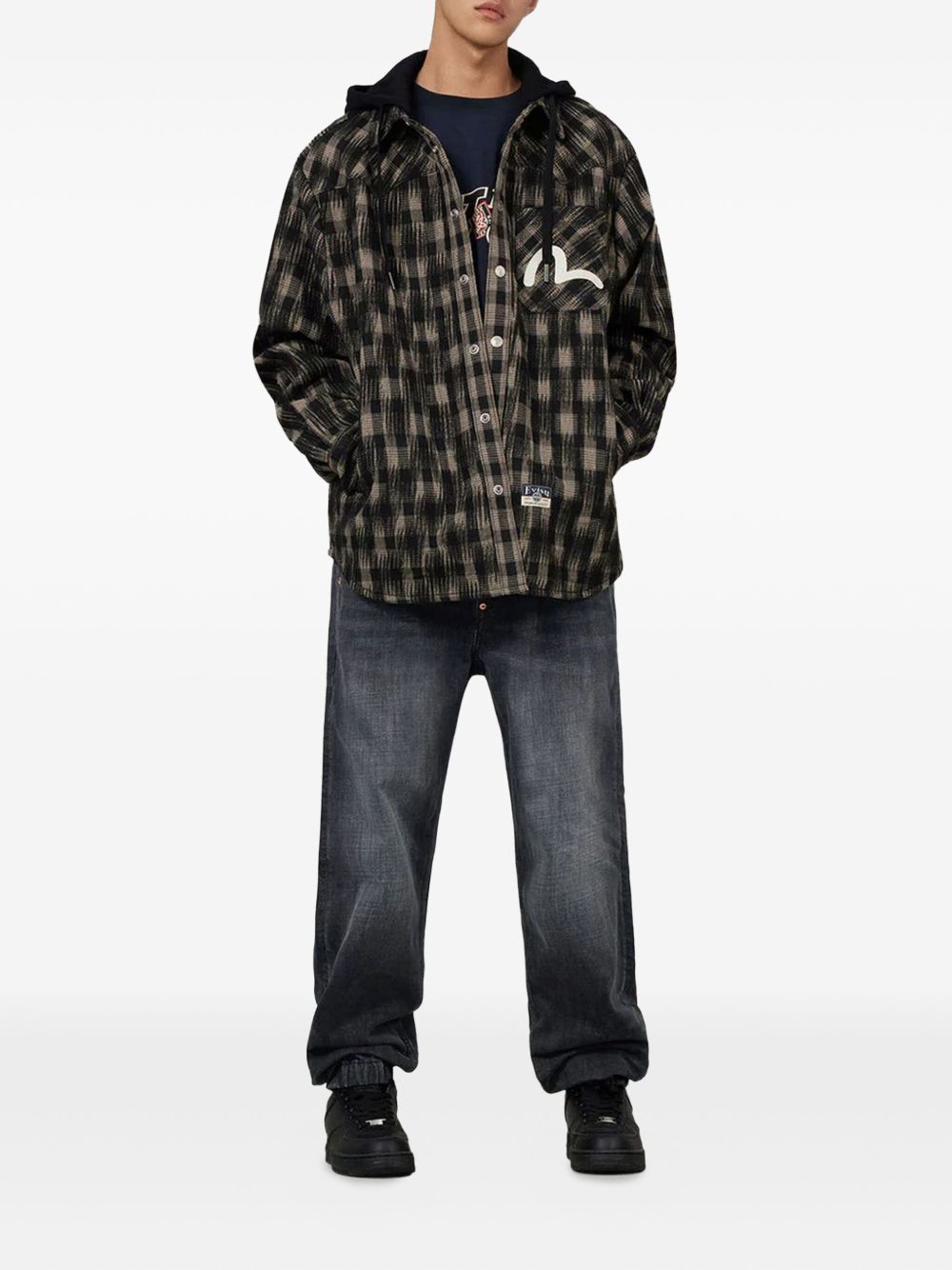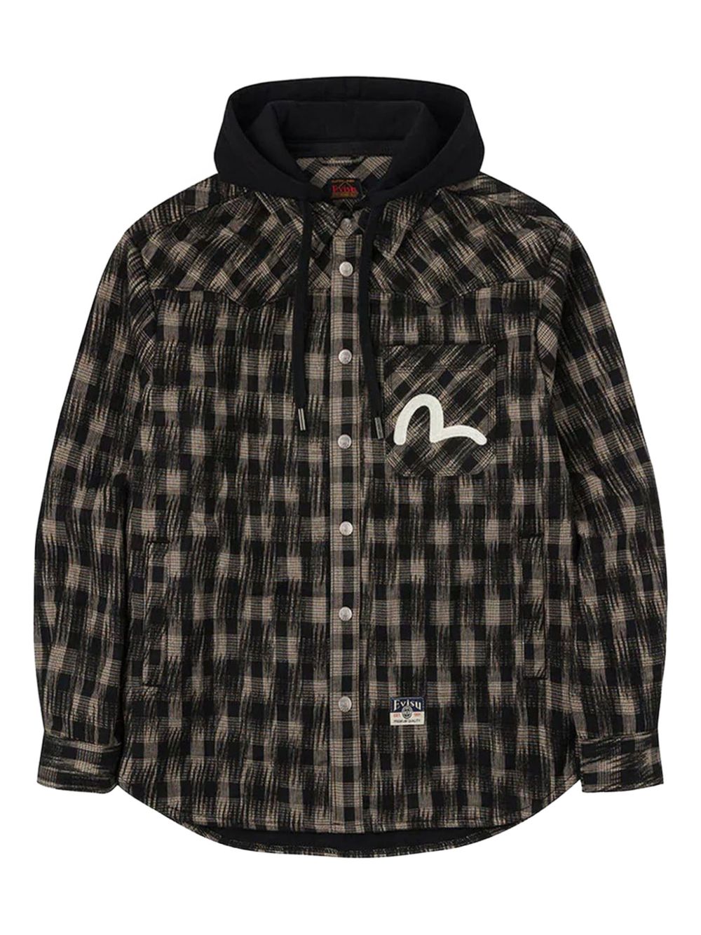realizzata in poliestere, cappuccio con coulisse regolabile, motivo a quadri, logo ricamato sul petto, chiusura frontale con bottoni, due tasche laterali e una sul petto, etichetta Kamon giapponese Evisu, taglio oversize, 92% poliestere, 5% cotone, 3% altre fibre