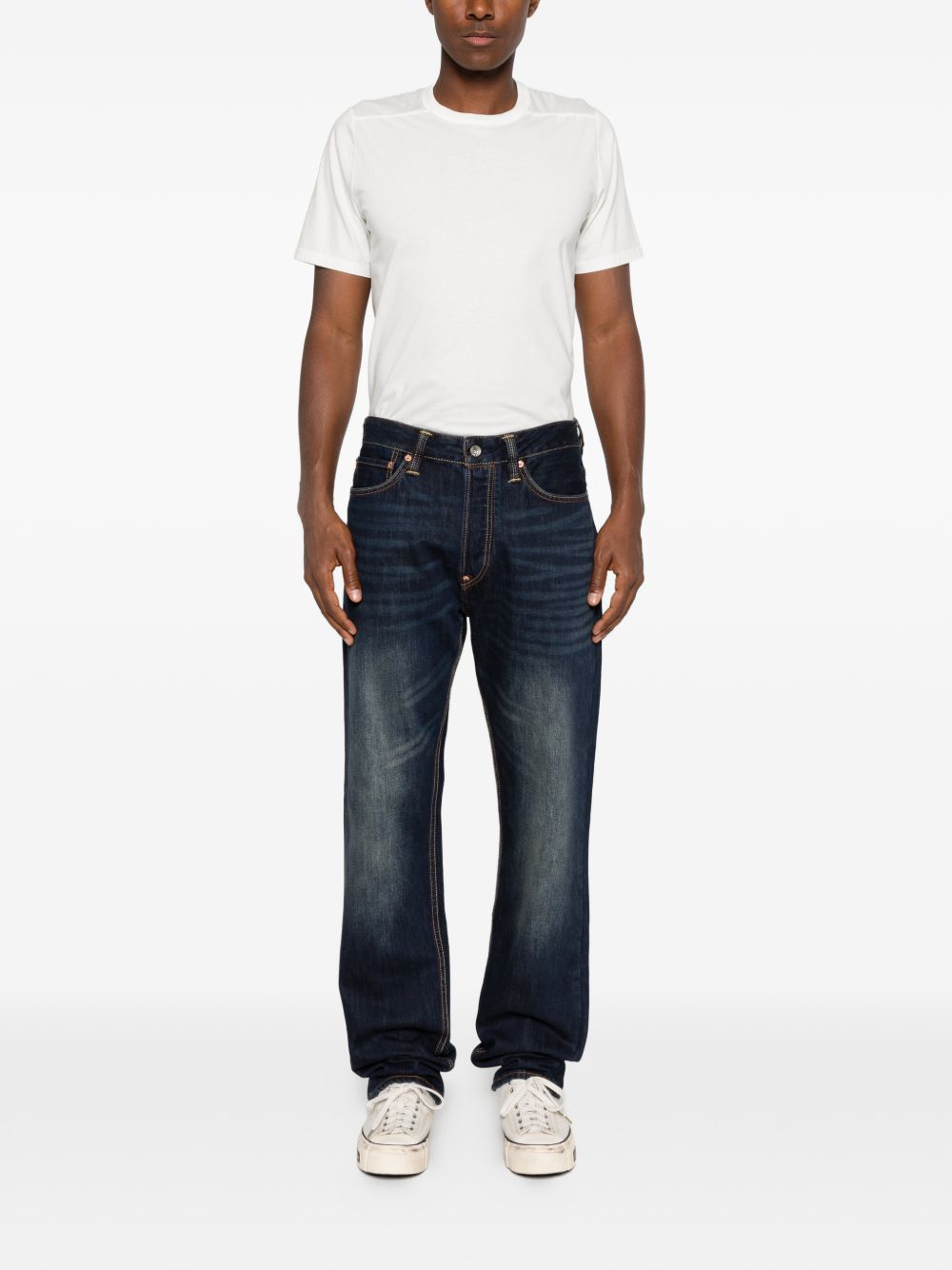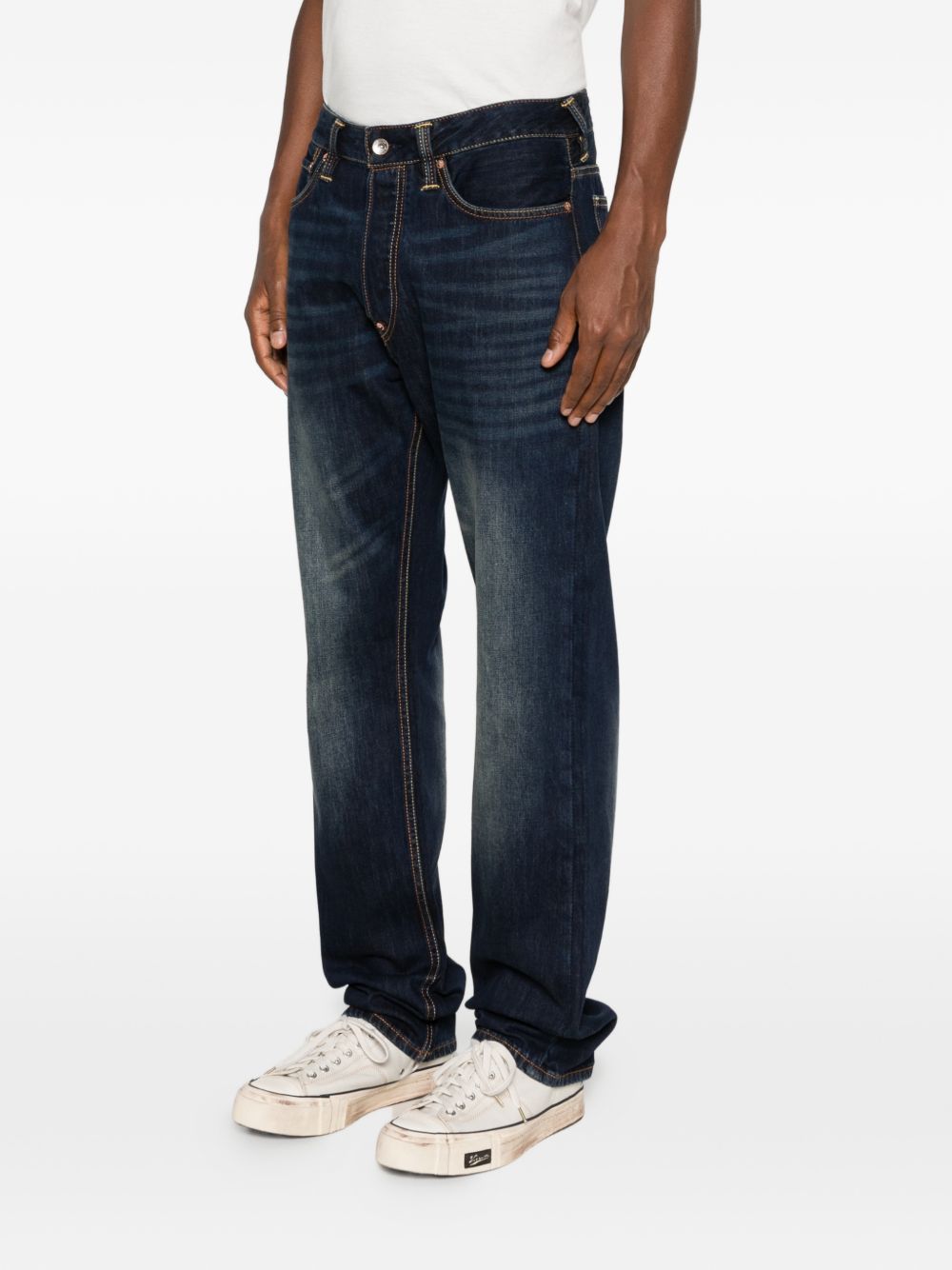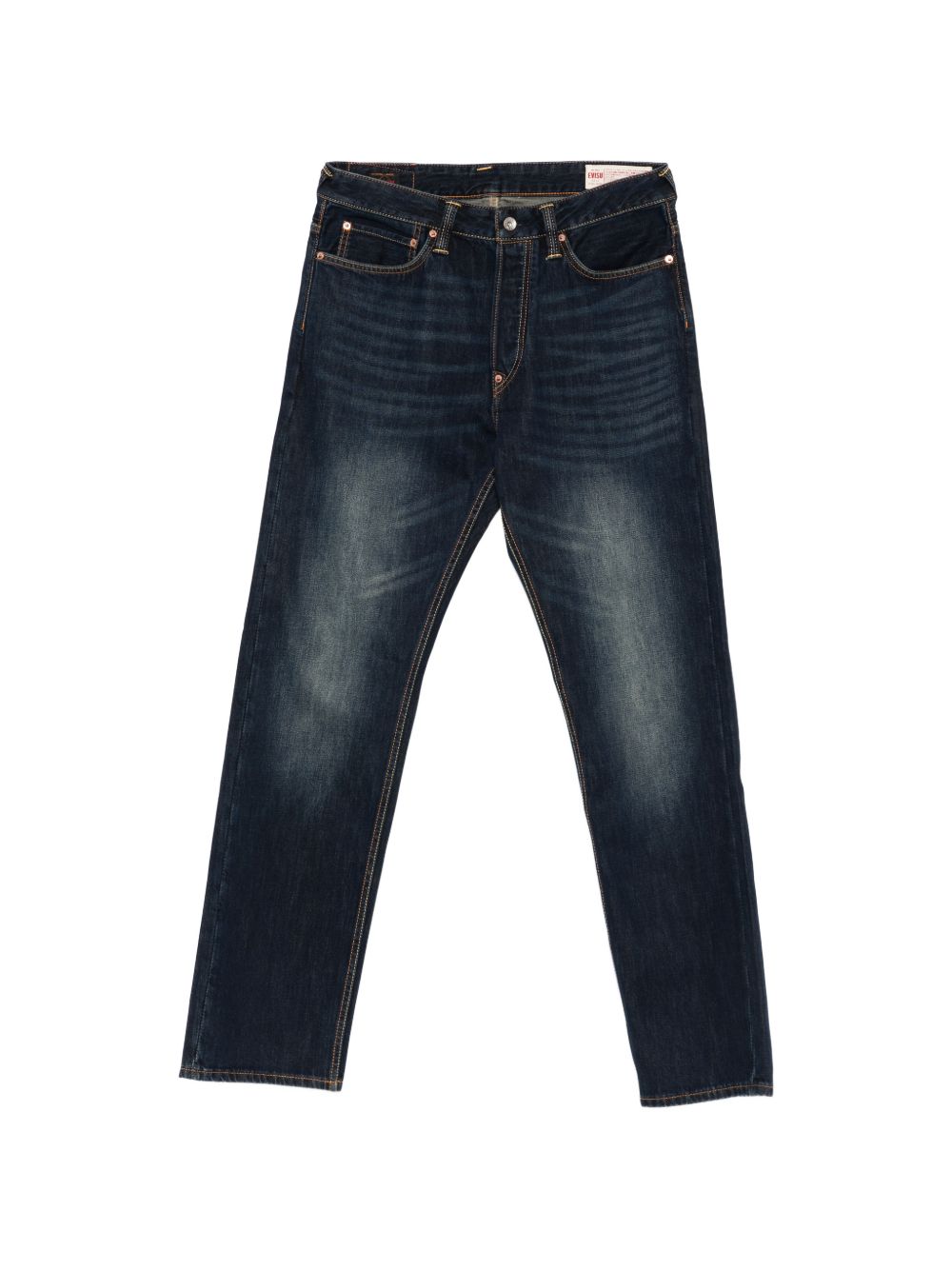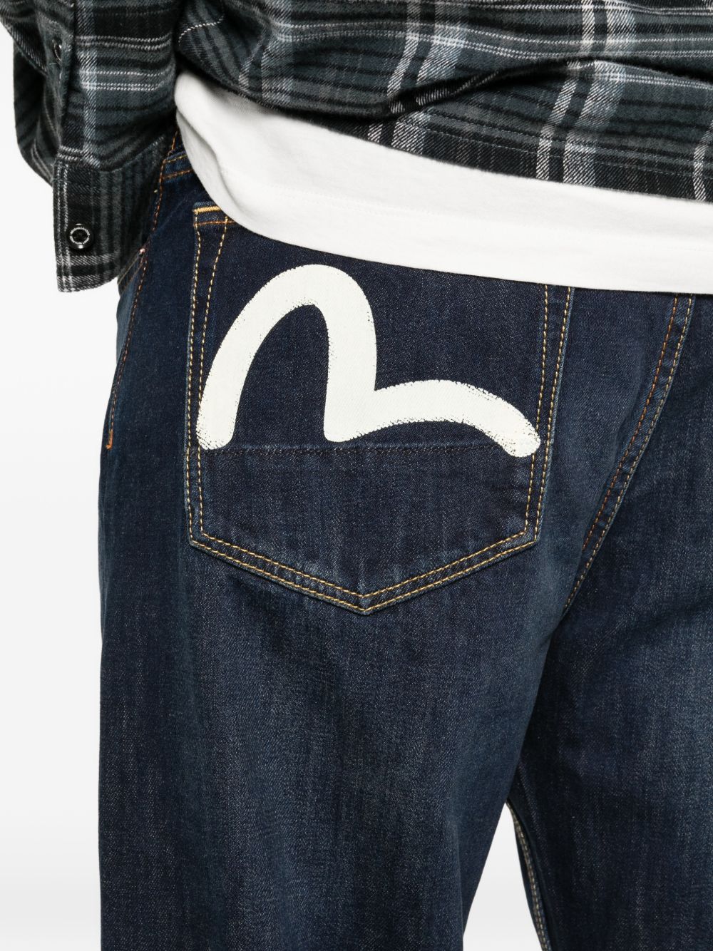 Jeans Evisu da uomo in denim indigo con logo gabbiano posteriore, elemento grafico iconico che definisce lo stile del brand.