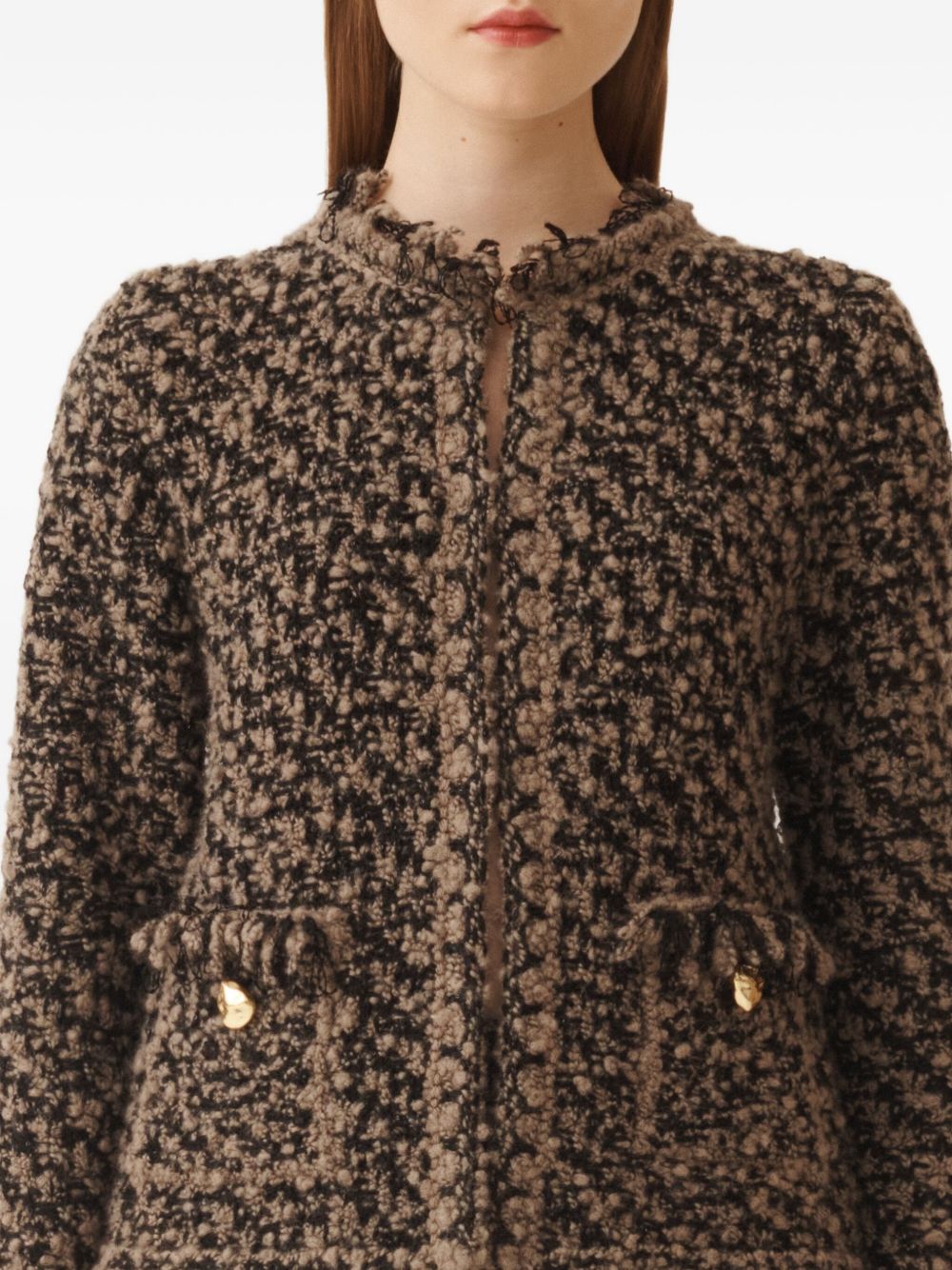 Realizzata in tweed, maniche lunghe, frange in fondo, due tasche davanti con dettaglio chiusura color oro, 100% tweed