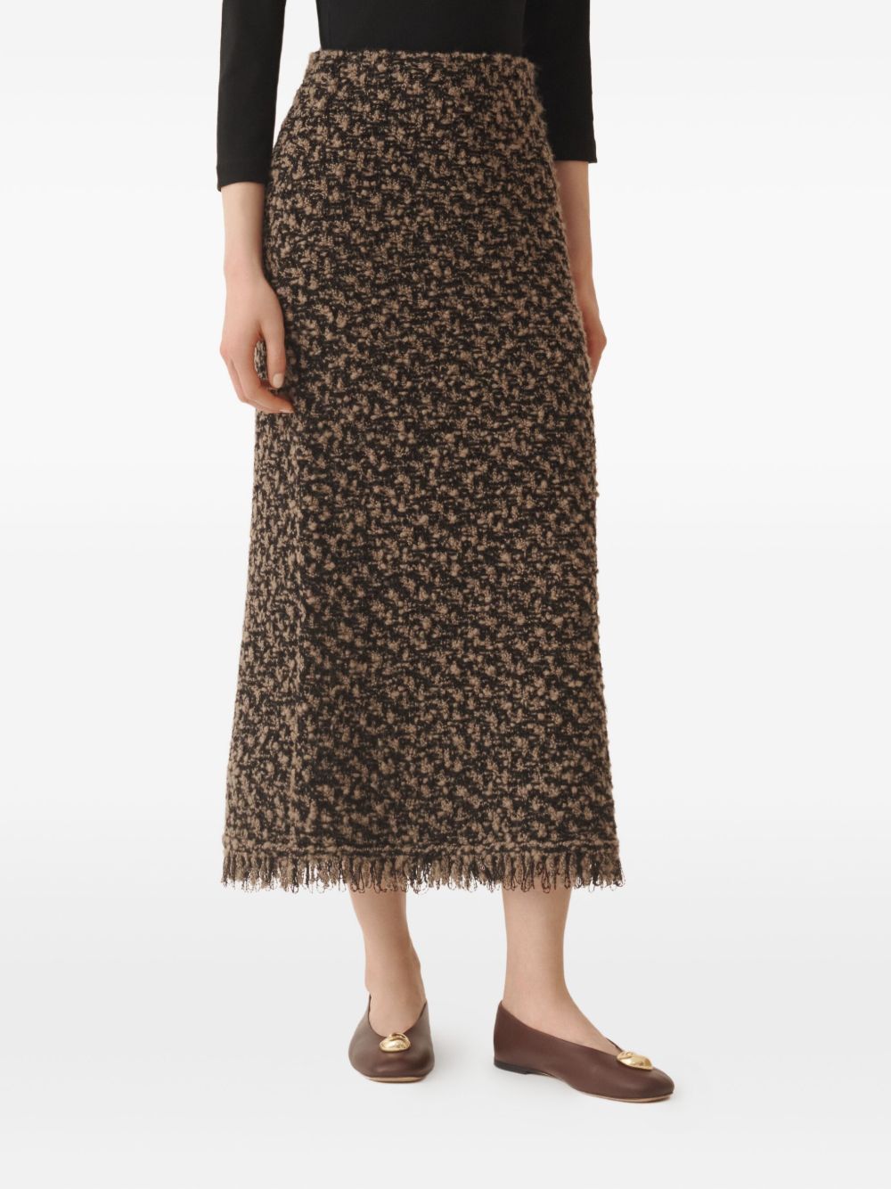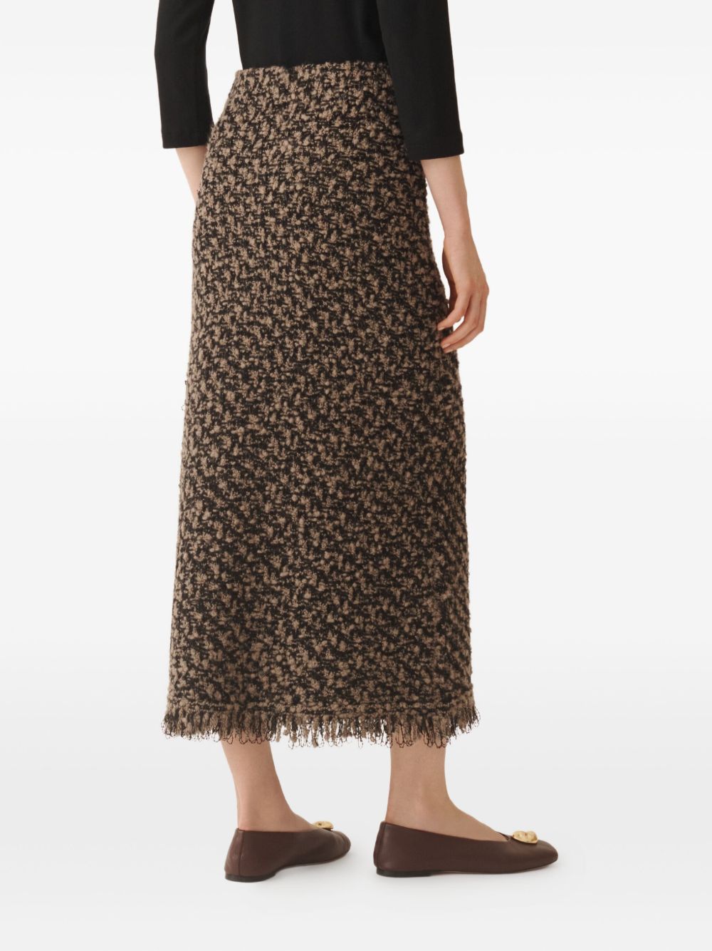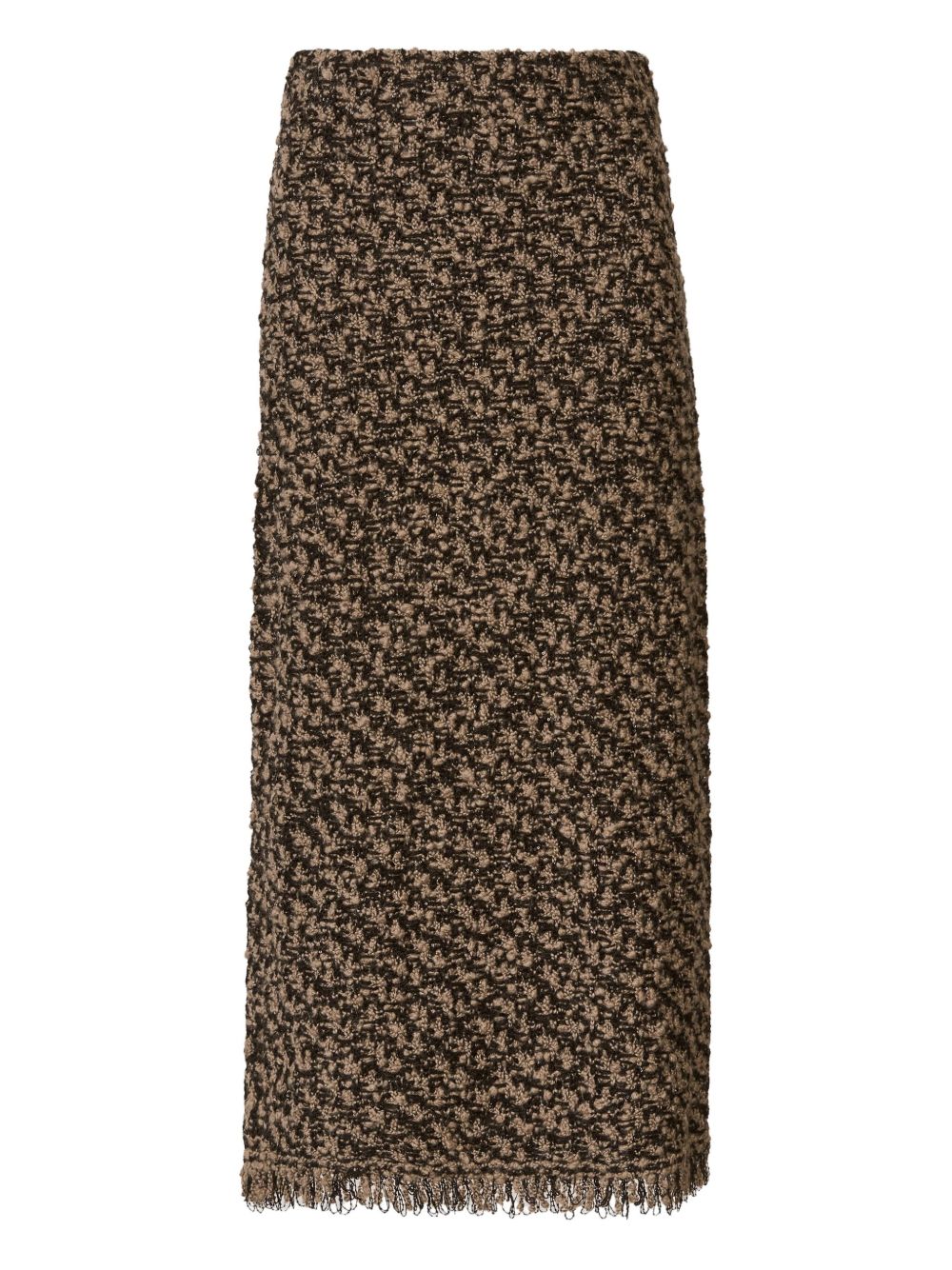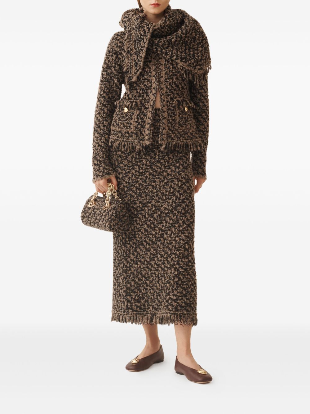Realizzata in tweed, maniche lunghe, frange in fondo, due tasche davanti con dettaglio chiusura color oro, 38% lana, 37% acrilica, 19% poliammide, 3% lana vergine, 1% seta, 1% cashmere, 1% poliestere
