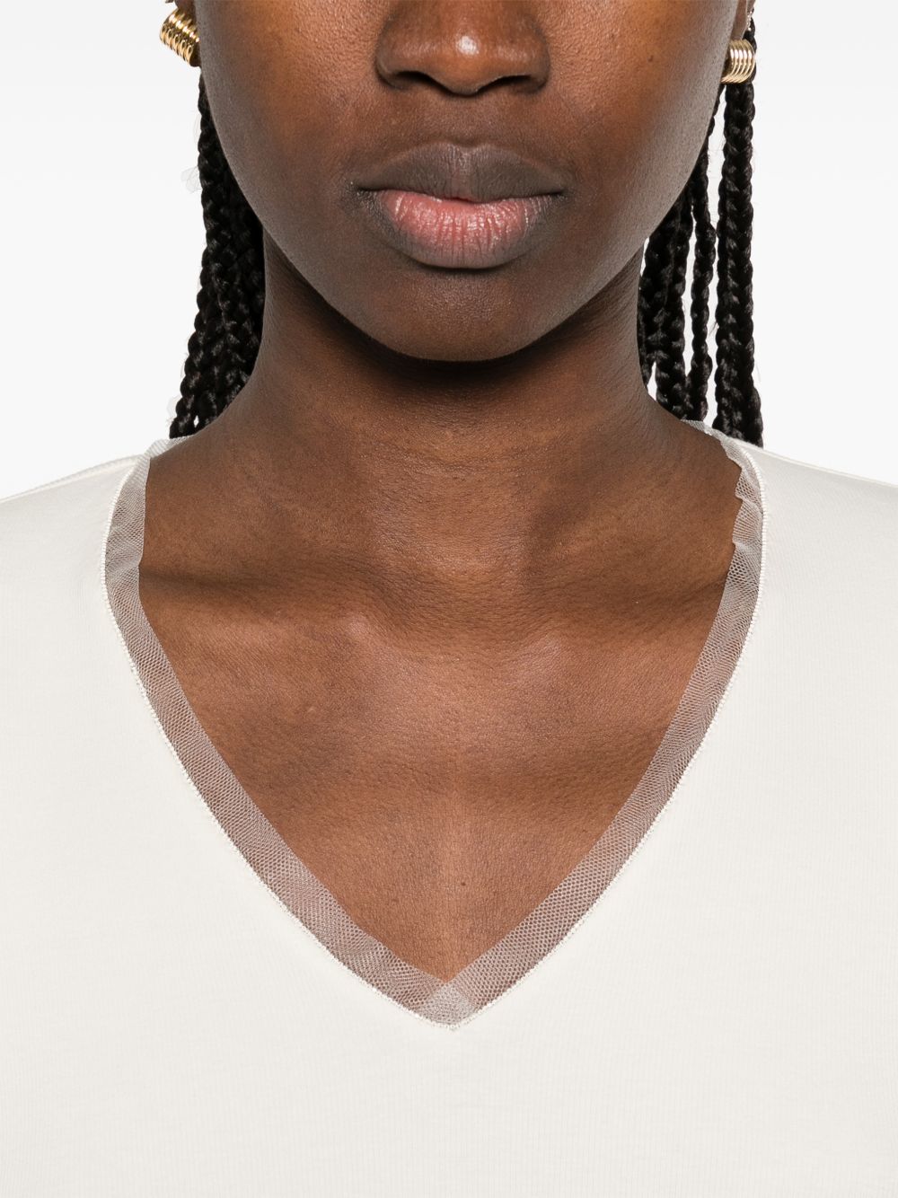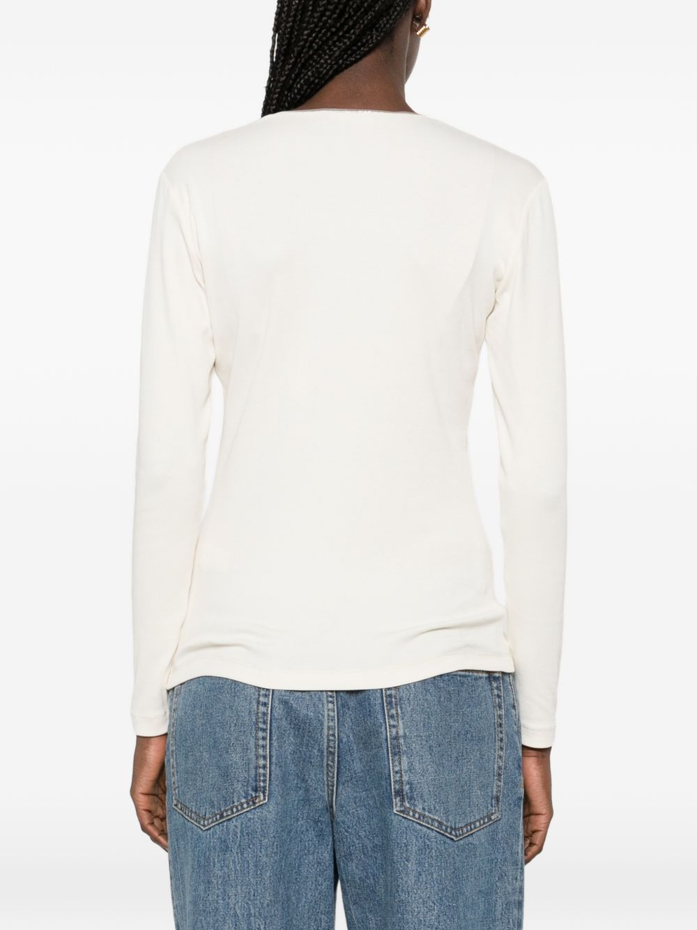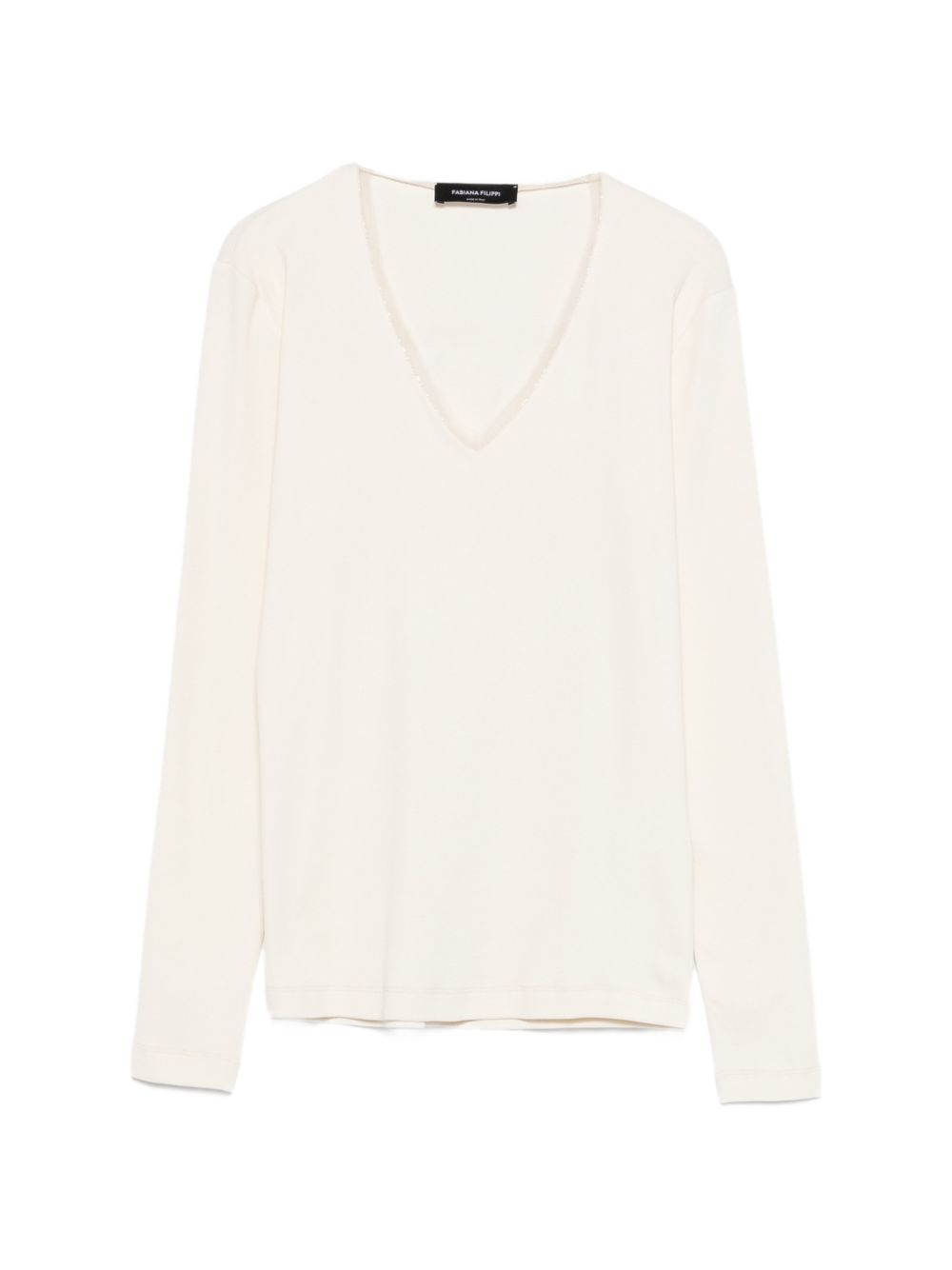 Realizzata in cotone, lavorazione a maglia, scollo a V, maniche lunghe, 94% cotone, 6% elastam