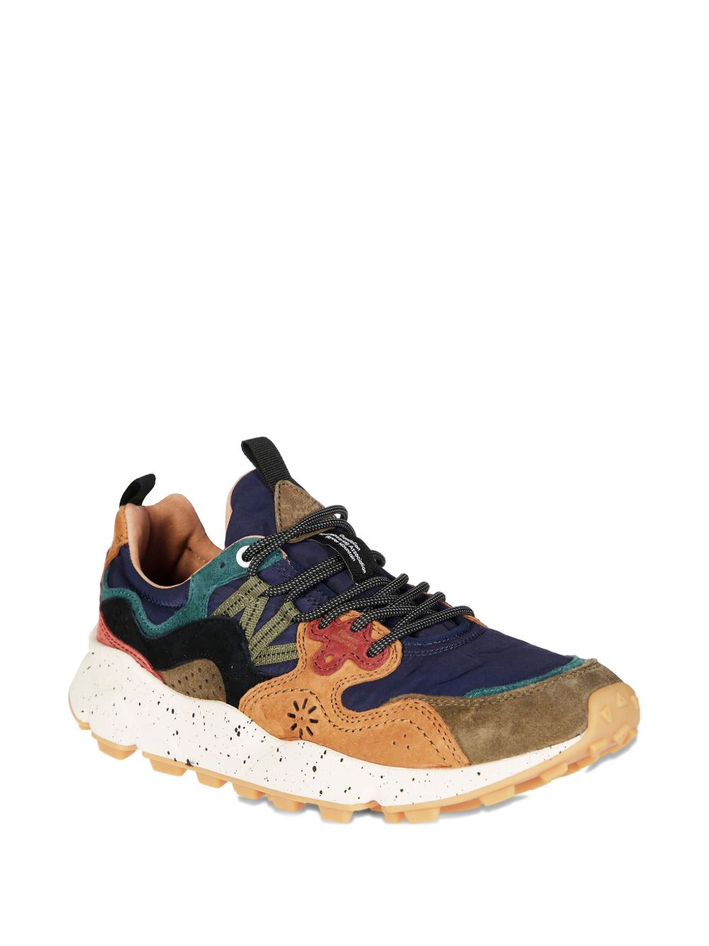 tomaia realizzata in tessuto tecnico e suede, soletta interna anatomica e antibatterica in sughero, lacci trekking, occhielli rinforzati, suola ultraleggera in gomma, battistrada dentellato
