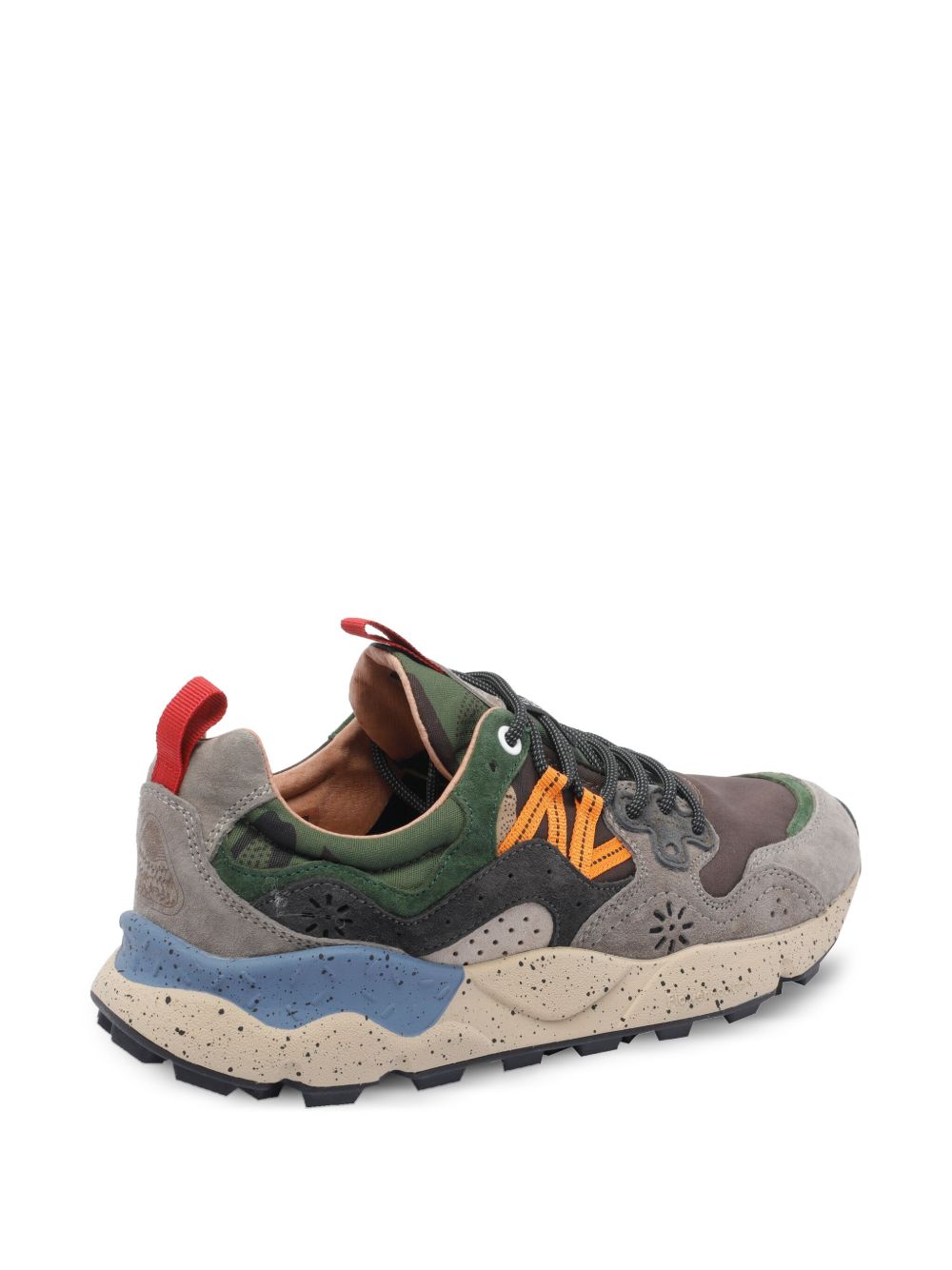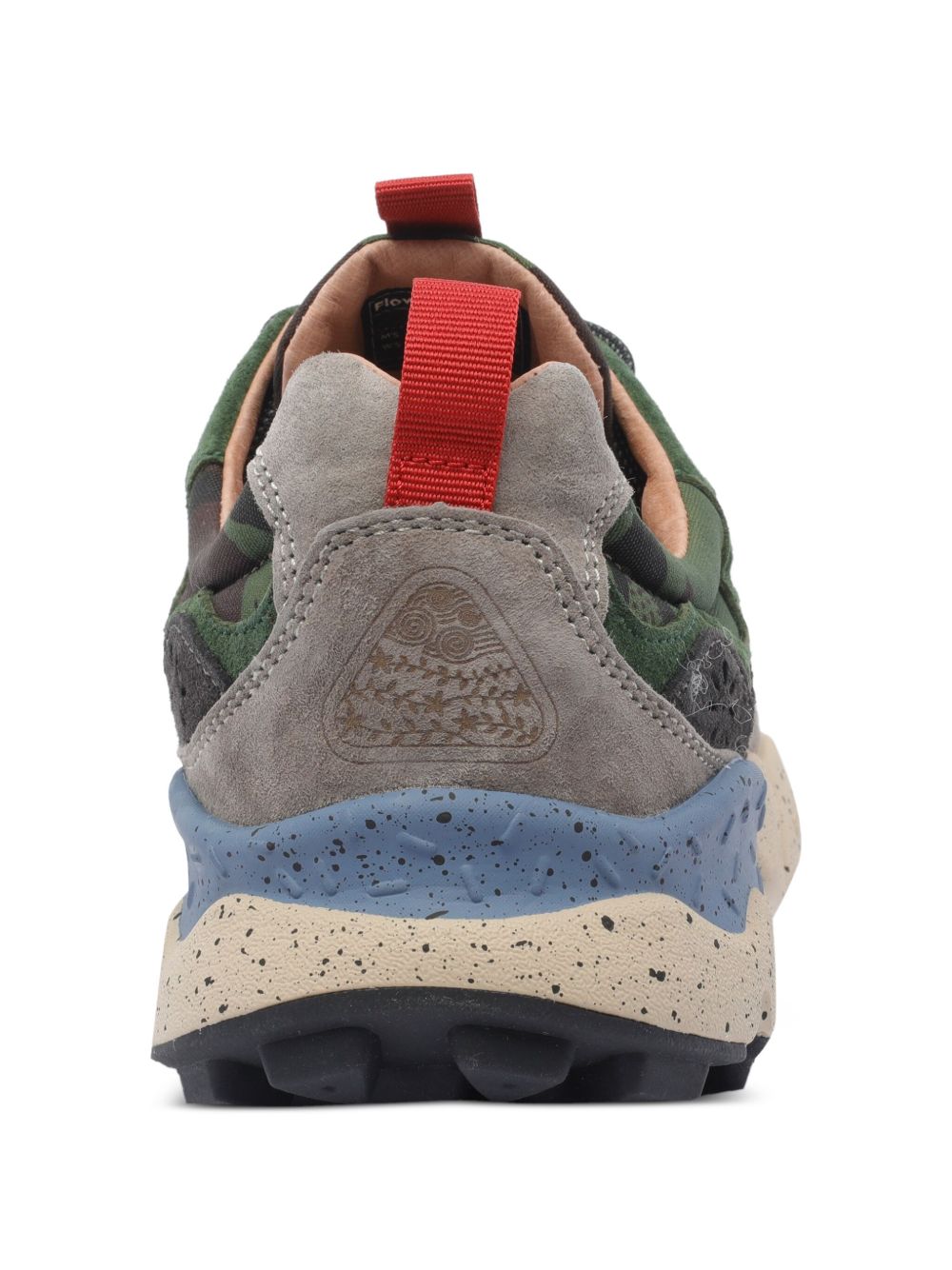 tomaia realizzata in tessuto tecnico e suede, soletta interna anatomica e antibatterica in sughero, lacci trekking, occhielli rinforzati, suola ultraleggera in gomma, battistrada dentellato