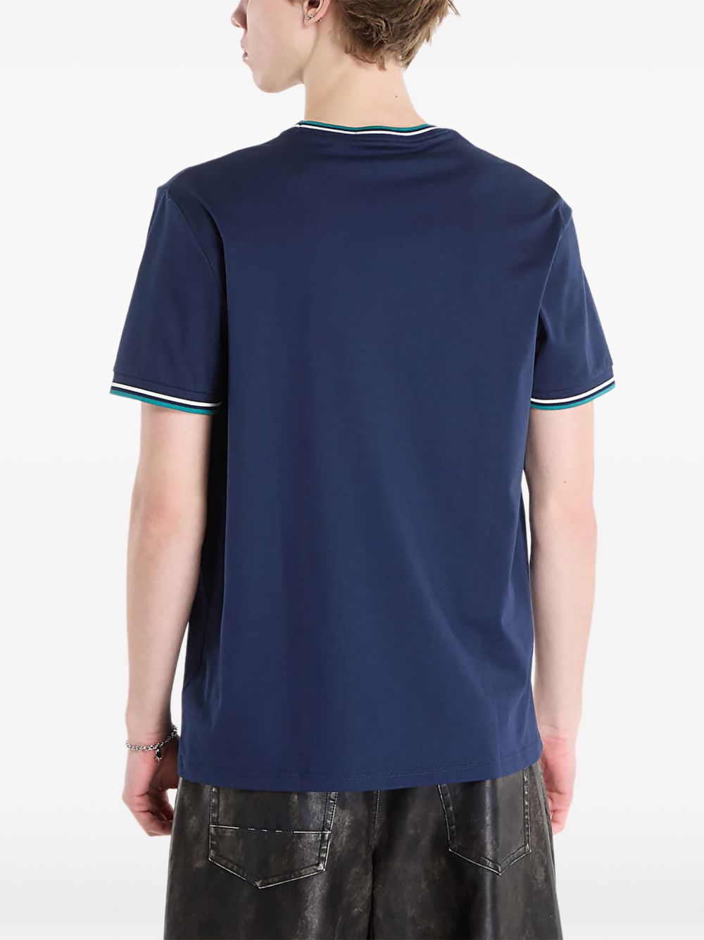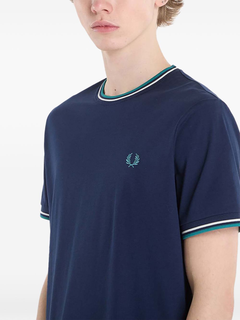 Realizzata in jersey di cotone, maniche corte, girocollo, dettaglio doppia riga a contrasto su colletto e bordo manica, logo ricamato sul petto, 100% cotone