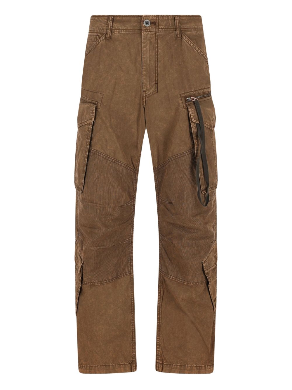 Realizzato con cotone rigido, chiusura frontale con cerniera e bottone, tasche cargo con zip e bottone, due tasche dietro con chiusura a patta, 70% cotone, 30% cotone riciclato