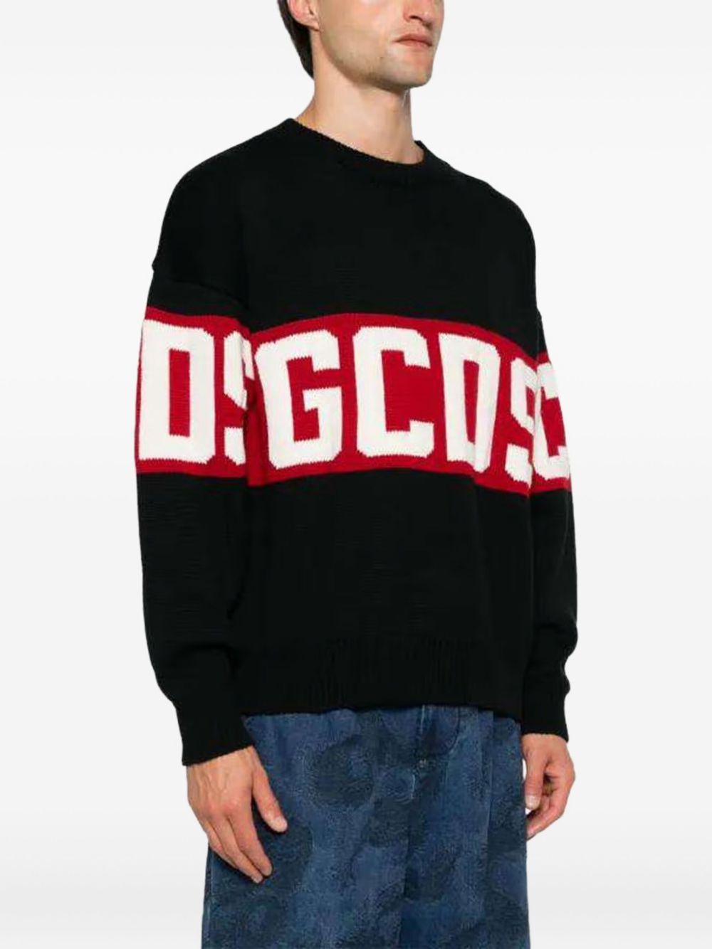 realizzato in misto lana a maglia rasata, girocollo, maniche lunghe, logo intarsiato sul davanti sul retro e sulle maniche, vestibilità regolare, 50% lana, 50% acrilico