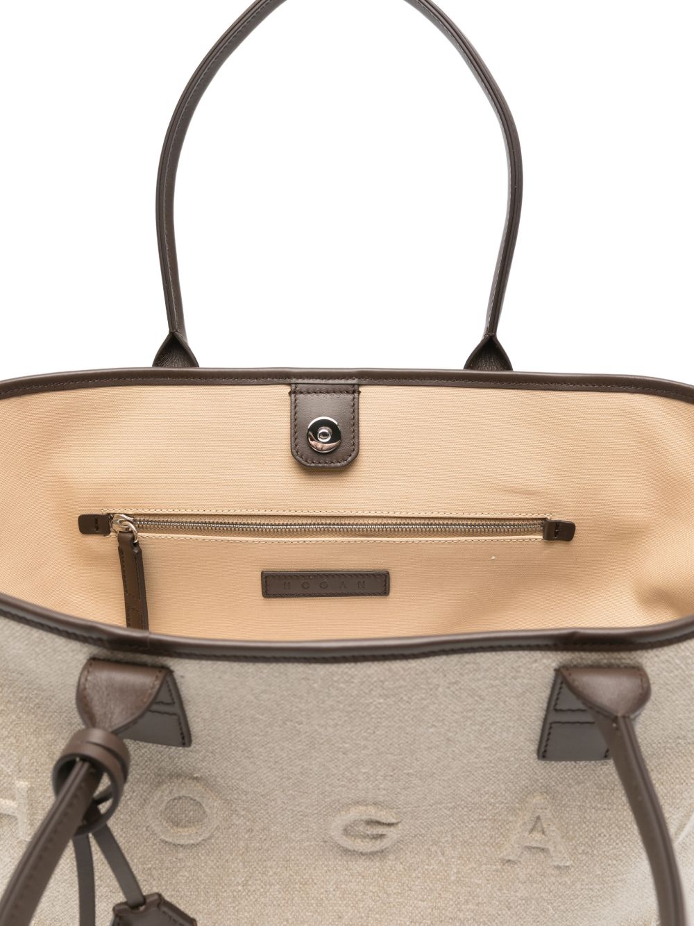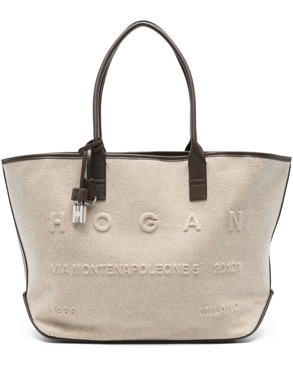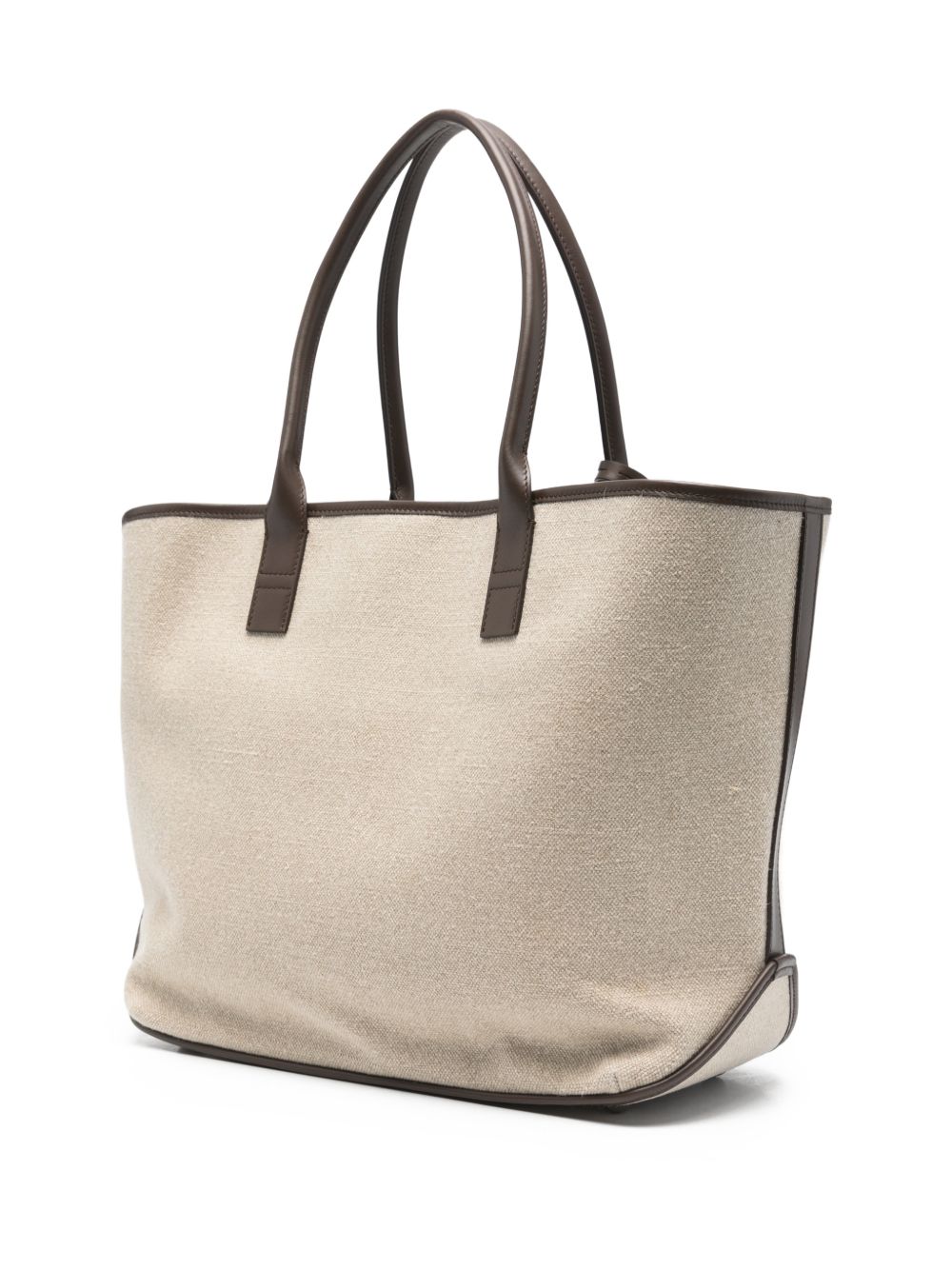 Realizzata in lino, piedini sotto in metallo, logo e scritta in rilievo davanti, chiusura superiore con bottone magnetico, doppio manico superiore, tasca interna con cerniera, dettaglio charm logo in metallo, 50 x 30 x 15,5 cm,