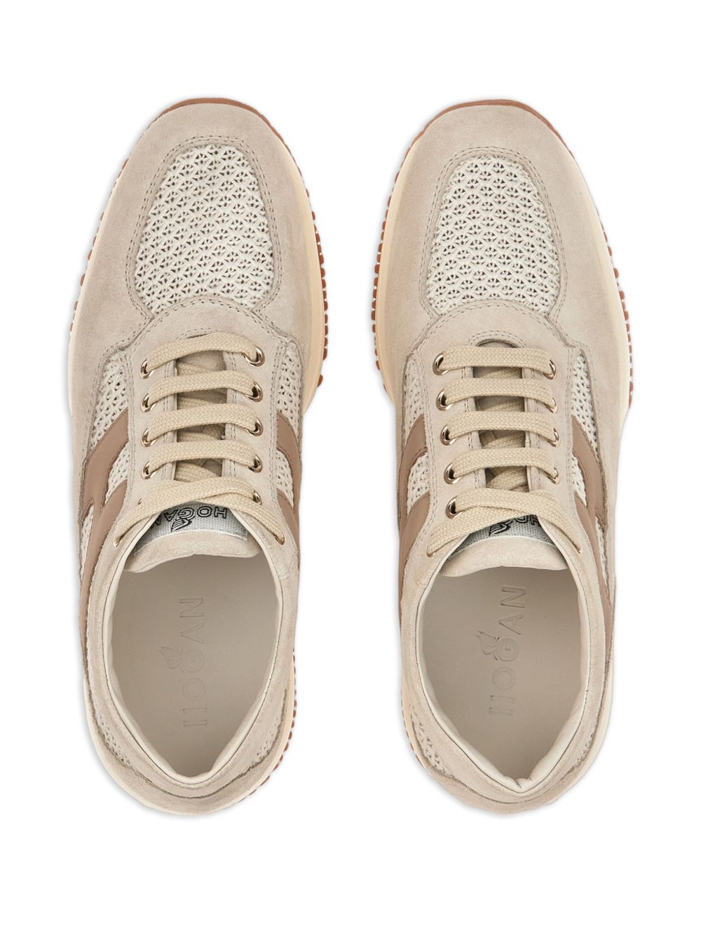 tomaia realizzata in pelle scamosciata, logo laterale, dettagli in tessuto tecnico, suola in gomma alta 5.7 cm
