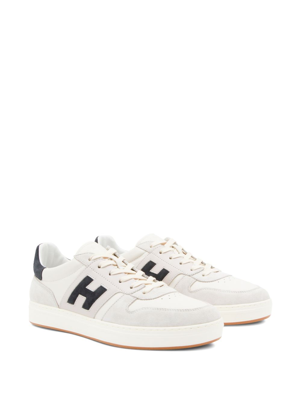 tomaia realizzata in pelle scamosciata, inserti in tessuto, logo laterale in pelle liscia, soletta in memory foam alta 8 mm, suola in gomma alta 3,5 cm