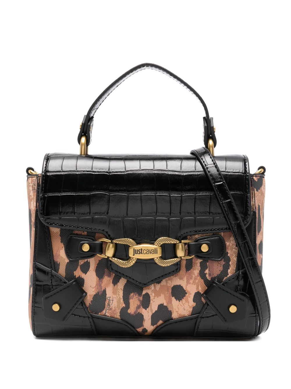 realizzata in ecopelle, finitura lucida effetto coccodrillo goffrato, dettaglio animalier, manico singolo, tracolla removibile, logo placcato in metallo color oro, chiusura superiore con pattina e bottone magnetico, scomparto unico